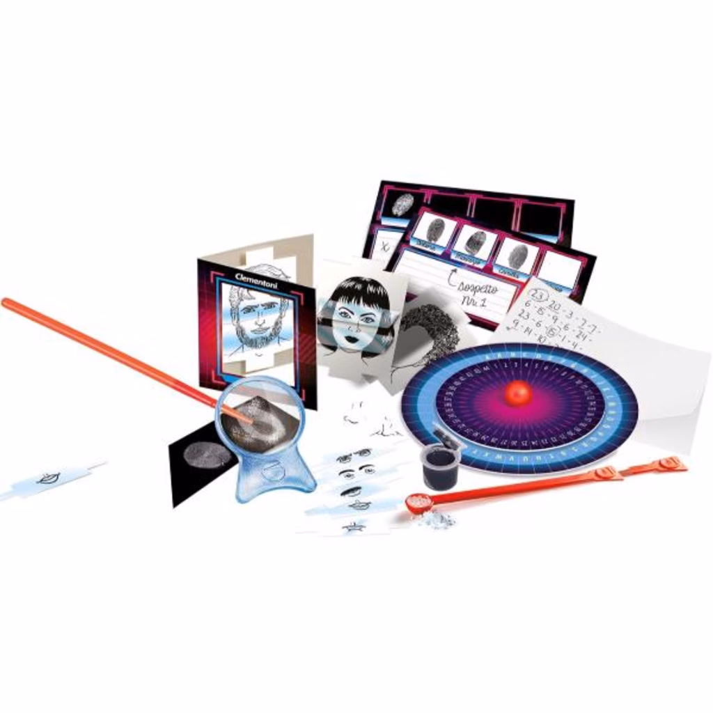 CONTENUTO DEL GIOCO: lente d'ingrandimento, pennello, rilevatore d'impronte, elementi per identikit, lettore per messaggi segreti, schede impronte, manuale illustrato e tanti altri accessori per risolvere enigmi investigativi