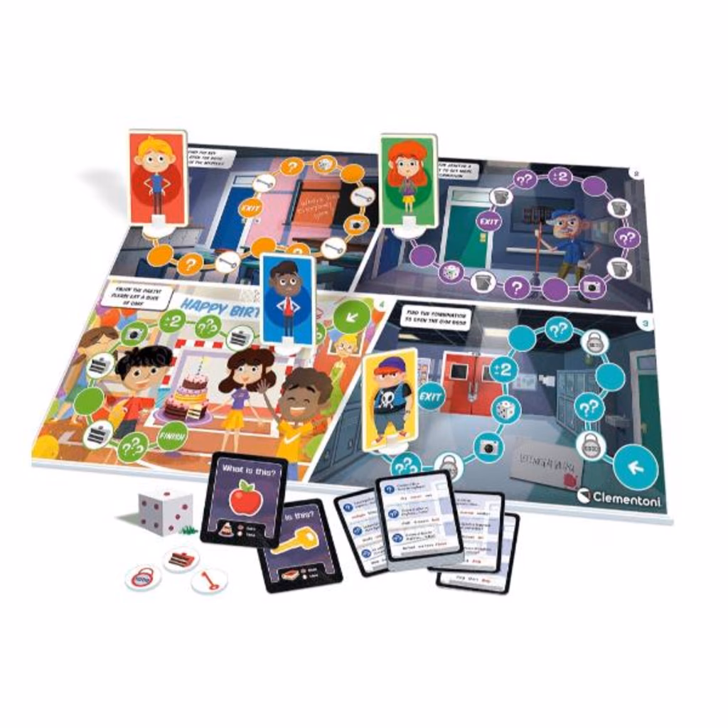 Un originale e misterioso gioco di percorso per imparare linglese in modo facile e divertente. Tante domande in linea con il programma scolastico ed app dedicata. 4 stanze da cui uscire risolvendo gli enigmi. Tante domande simpatiche e istruttive in linea con il percorso didattico della scuola primaria per bambini e bambine in età scolare. Rispondendo correttamente alle domande sulla lingua inglese conquisterai gli oggetti giusti per uscire da ciascuna stanza ed arrivare per primo alla festa superando gli avversari. Un gioco da tavolo con cui si può giocare da 2 a 4 giocatori. Pensato per sviluppare linglese, la comprensione del testo in lingua straniera e la memoria e per aiutare a stimolare capacità logiche e di osservazione autonomia e socialità.