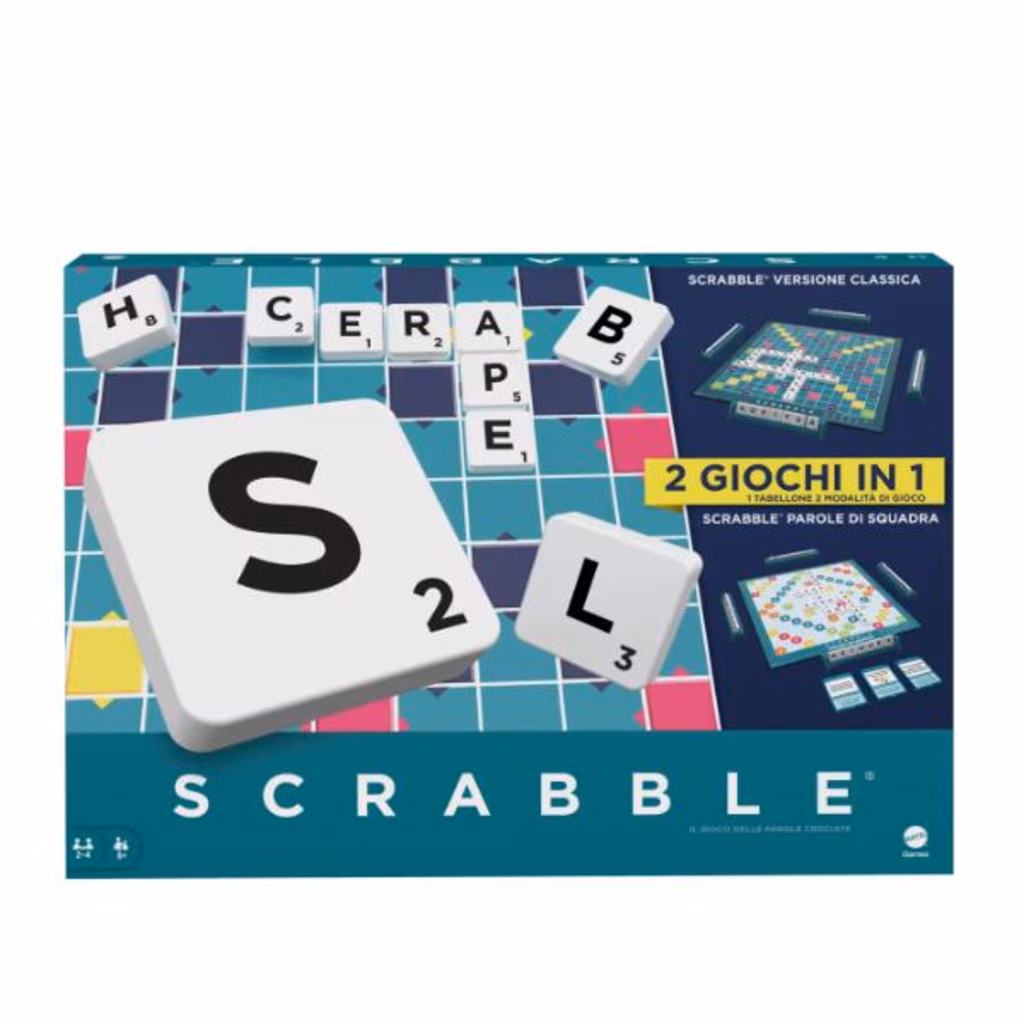 Scopri il divertimento oltre le parole con il gioco da tavolo Scrabble®, ora con due giochi in uno! I giocatori possono divertirsi con il classico gioco delle parole crociate Scrabble® che conoscono e amano creando parole e cercando di ottenere punteggi di Lettera Doppia e Parola Tripla, oppure possono girare il tabellone e provare Scrabble Parole di Squadra, un gioco semplice e veloce in cui i giocatori cooperano per completare le sfide delle parole.