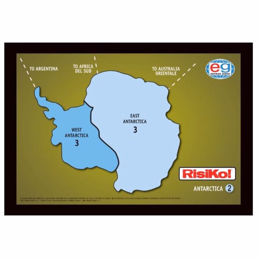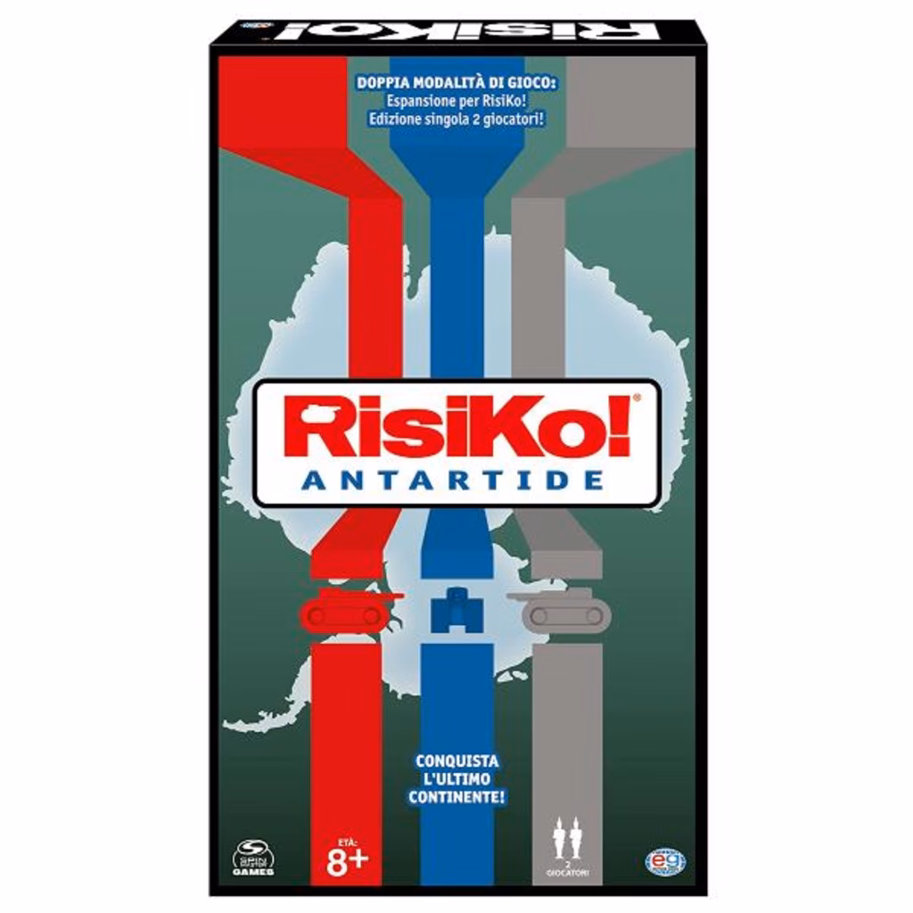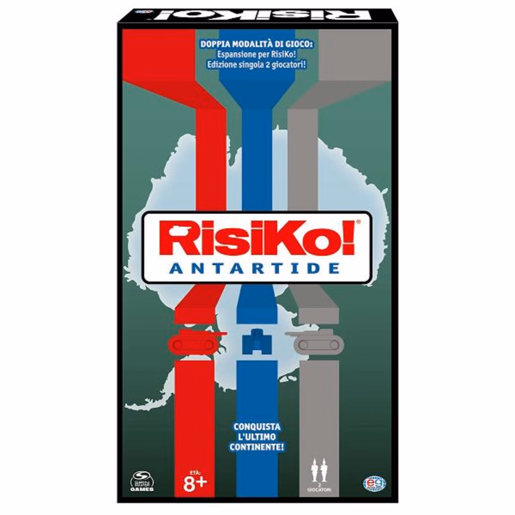 RisiKo! Antartide è la prima edizione di RisiKo!, il gioco di strategia più conosciuto in Italia, che include due giochi in uno. In questa versione la plancia è stampata fronte e retro per offrire due esperienze di gioco diverse. 1 modalità a due giocatori: da un lato la plancia raffigura l'Antartite suddivisa in 42 territori. Un vero e proprio testa a testa per la conquista dell'Antartide! Lo scenario di battaglia si sposta sul nuovo continente con nuovi territori e nuovi obiettivi! Tutta l'adrenalina del gioco di strategia più conosciuto, in una edizione unica! Sull'altro lato della plancia il continente dell'Antartide, diviso in due territori, l'Antartide Orientale e l'Antartide Occidentale, funge da espansione del gioco originale. Se aggiunta come settimo continente alla parte sud dell'emisfero raffigurato sulla plancia di RisiKo! classico, trasforma l'intero scenario di conquista del mondo, fungendo da ponte tra territori e continenti fino ad ora lontani anni luce. Devi conquistare 24 territori non sarà più un'obiettivo impossbile.