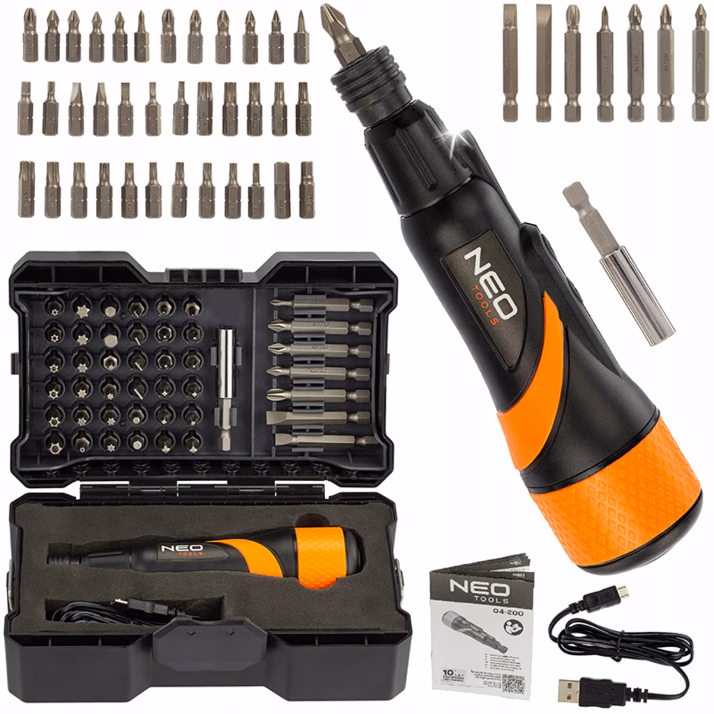 Micro-USB 3.6V, cacciavite a batteria agli ioni di litio, scatola di plastica + accessori, NEO TOOLS, cacciavite multifunzione con punte sostituibili per più tipi di lavoro. Caratteristiche del prodotto: ricarica facile tramite porta USB, design ergonomico, rotazioni destra/sinistra, illuminazione del posto di lavoro, custodia a portata di mano. Accessori: inserti corti - 36 pz, inserti lunghi - 7 pezzi, adattatore per inserti, cavo di alimentazione, contenitore di plastica. Specifiche tecniche: Voltaggio batteria: 3,6 V - Tipo di batteria: agli ioni di litio - capacità della batteria: 800 mAh - portautensili: esagonale, 1/4 (6,35 mm) - max. coppia: 2,1 Nm