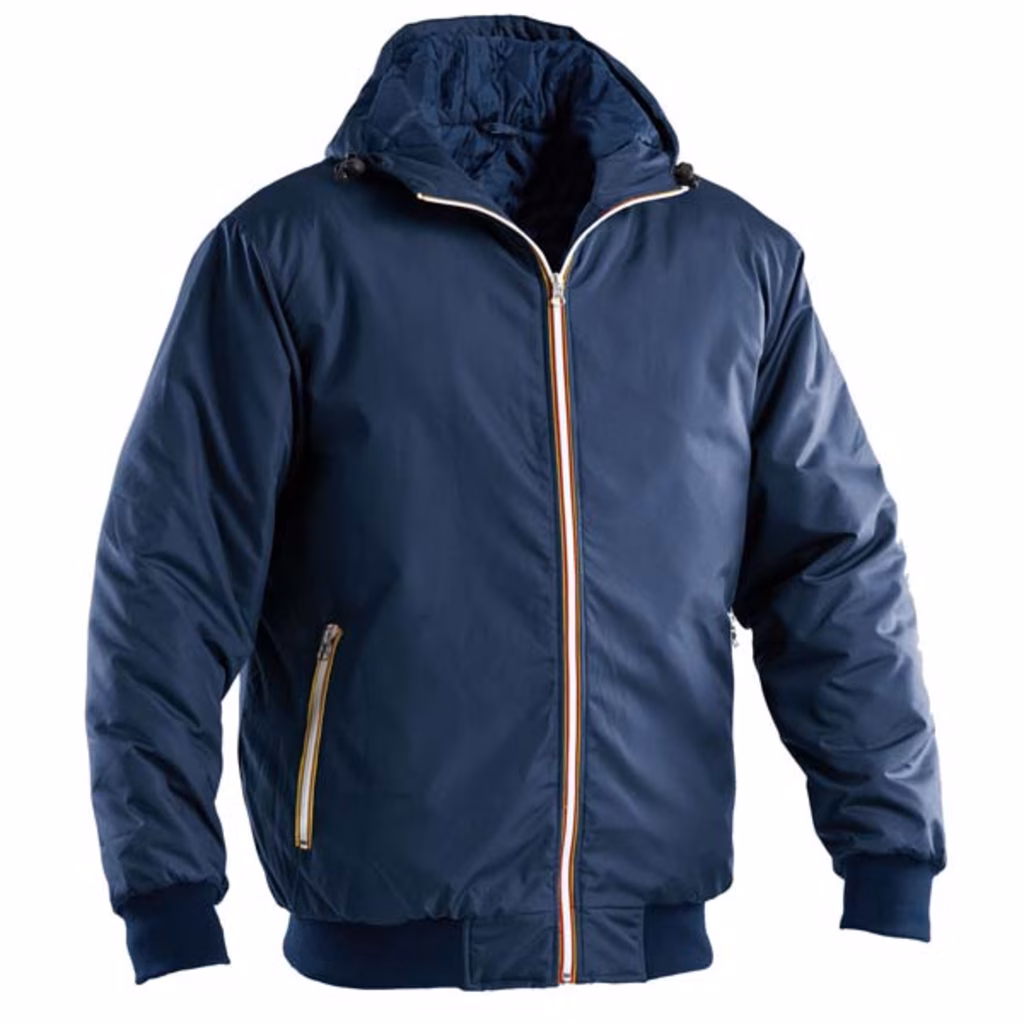 Giubbino bomber imbottito - cappuccio con stringicorda - cerniera frontale colorata - 2 tasche inferiori chiuse con cerniera colorata e 1 tasca interna - polsini e fondo giacca in maglina elasticizzata - tessuto esterno in poliestere micro peach ristop con spalmatura impermeabile - imbottitura 160 g/m²