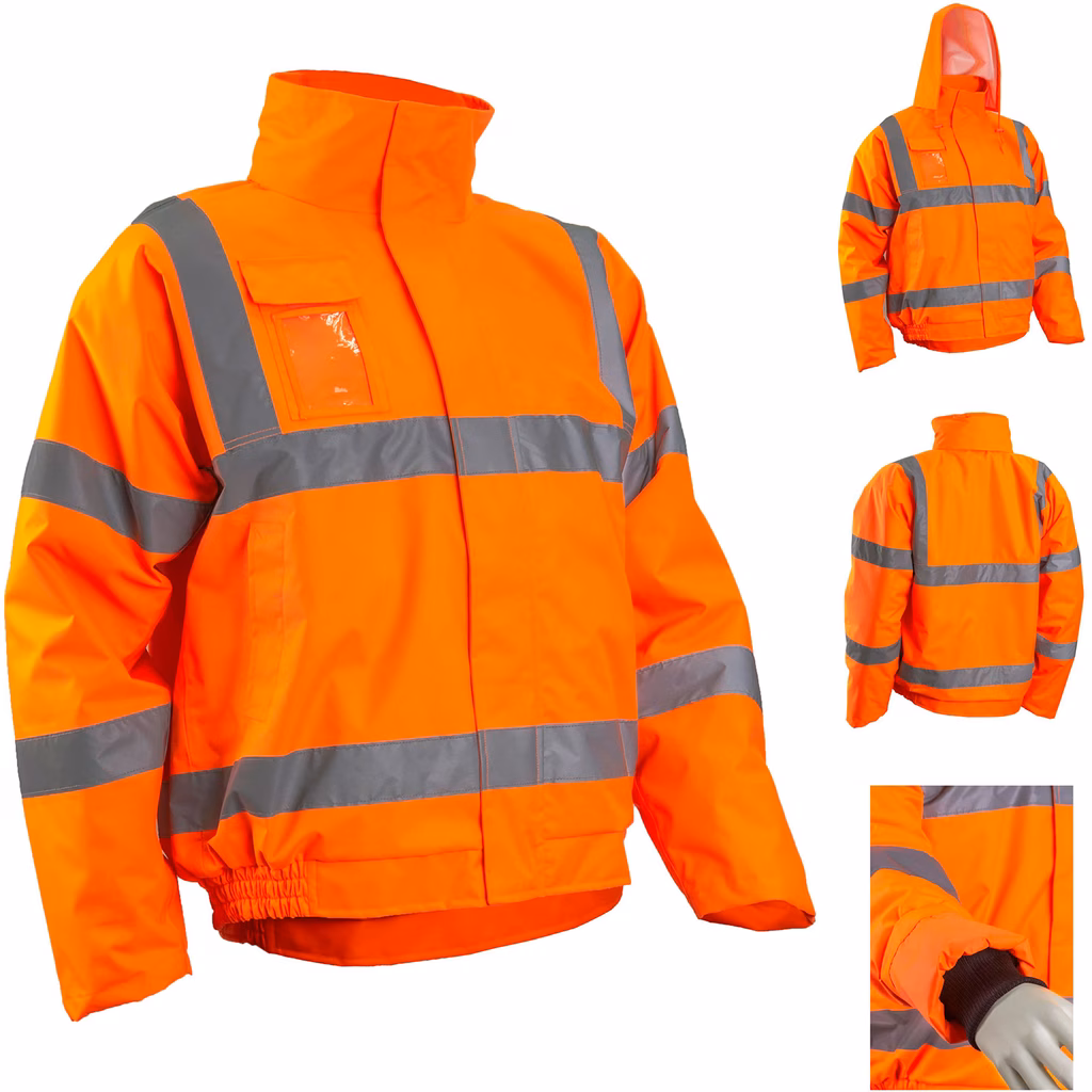 Giubbotto alta visibilità in tessuto 100% poliestere spalmato poliuretano - taffetà 300d: 100% poliestere - imbottitura 50 g/m2 - 160 g/m2 (corpo) + 140 g/m2 (maniche) bande retroriflettenti: bande mcirobilles cucite: larghezza 5 cm impermeabilità: polsini impermeabili 3.000 mm, cappuccio fisso integrato nel collo + coulisse elasticizzata e bloccanti, alto collo, centrale zip doppio cursore sotto patta velcro 1 tasca petto patch con patta chiusa da velcro + portabadge in plastica, 2 tasche verdiical basse sotto patta, 1 tasca napoleon 1 tasca interna toppa chiusa da velcro maniche effetto kimono, polsinos antivento a coste, elastico in vita, fasce: doppio cinturino + doppio polsino + doppio girovita
