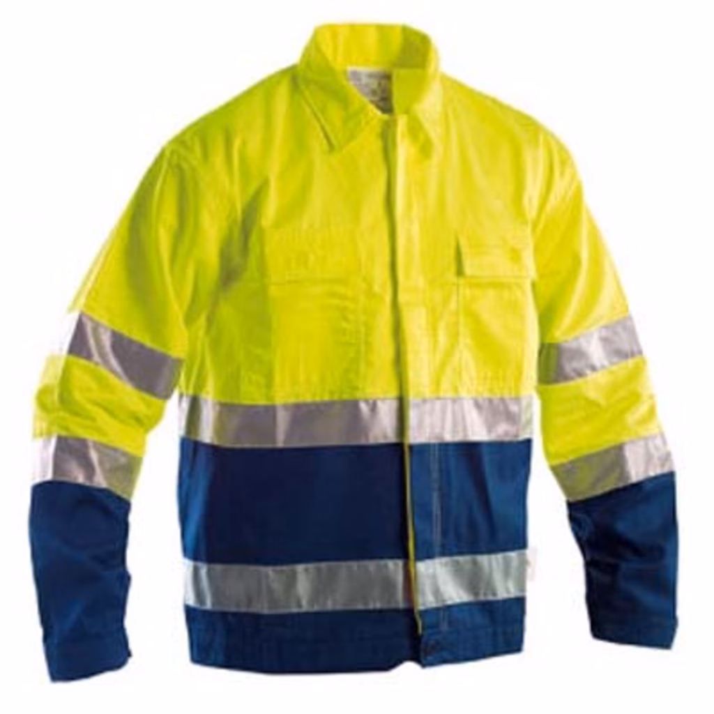 Giubbino alta visibilità con bande rifrangenti - collo a camicia - chiusura anteriore con bottoni coperti - due tasche al petto applicate chiuse con pattina e bottone - polsini fondo manica chiusi con bottone - doppie cuciture nei punti di maggior sforzo - certificato per 50 lavaggi