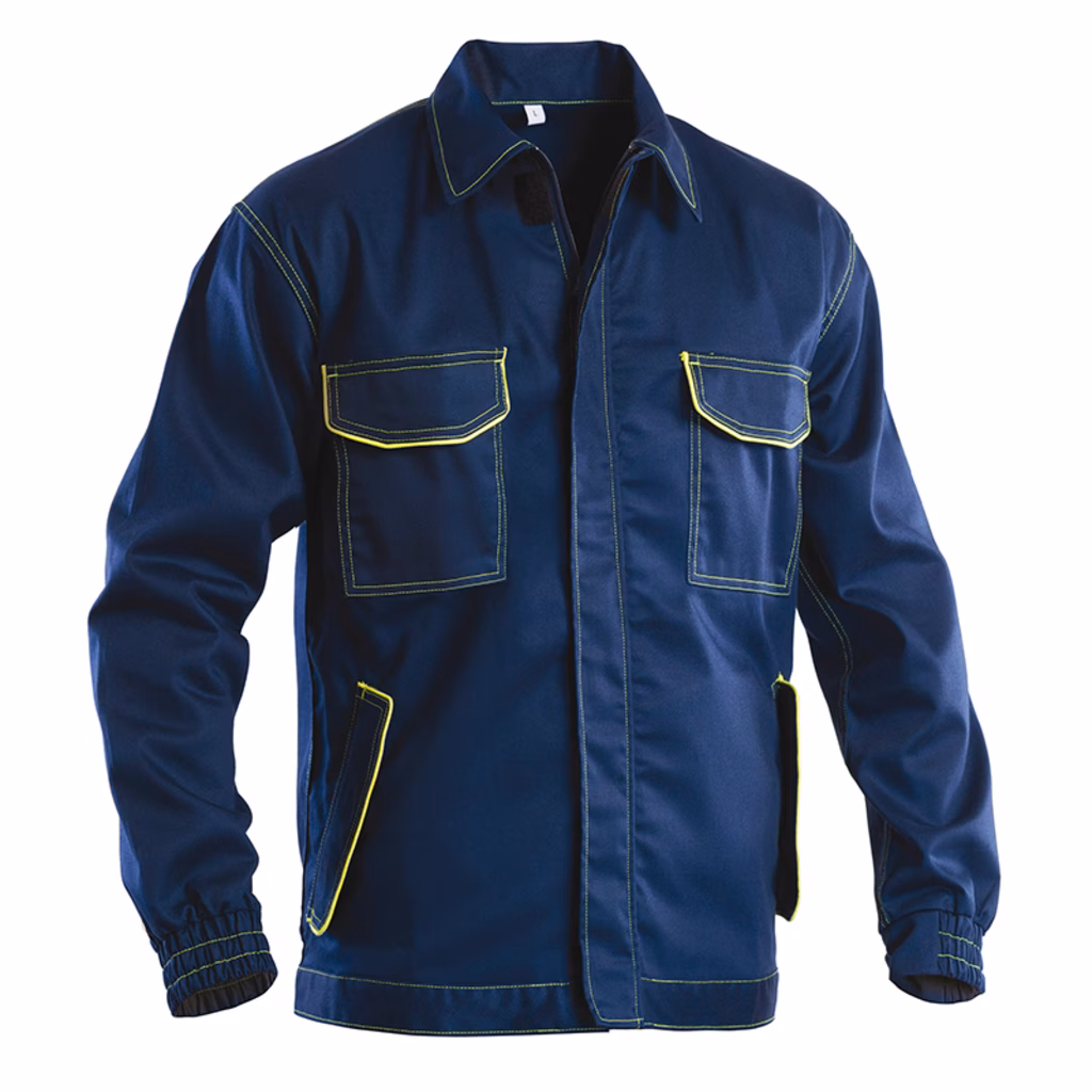 Giubbotto multiprotezione, chiusura frontale con cerniera coperta da finta, 2 tasche al petto chiuse con pattina e velcro, tasca portabadge al petto, 2 tasche inferiori a filetto chiuse con pattina e velcro, cuciture a contrasto e piping sulle tasche colore giallo fluo, polsini con mezzo elastico. IEC 61482-2 CLASSE 2 7KA, ATPV