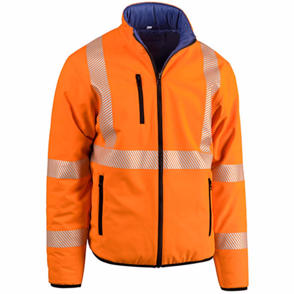 Giubbotto reversibie arancio HV/blu - chiusura centrale con cerniera - due tasche principali con cerniera ricoperta - Una tasca con cerniera ricoperta sul petto lato destro - Elastico in vita e ai polsi - Reversibile con la stessa soluzione di tasche