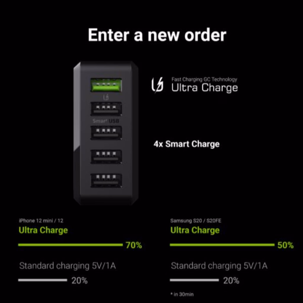 • Caricabatterie GC ChargeSource 5 dotato di 5 porte USB veloci, con una potenza totale di 52W - un moderno caricatore per tutti i dispositivi dotati di porte USB