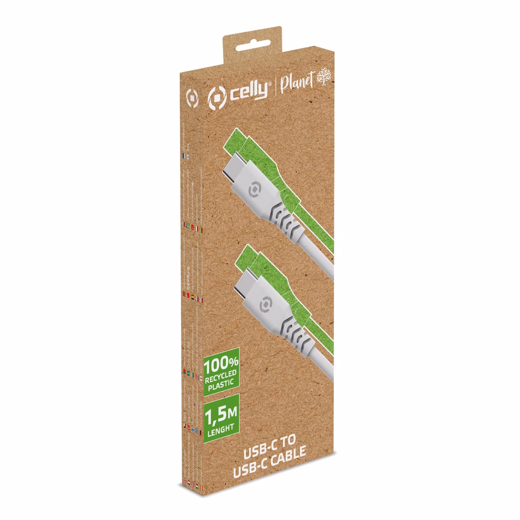 Cavo di Ricarica Eco-friendly da 1,5 metri in Plastica 100% RiciclataAlla ricerca di un modo per ricaricare i tuoi dispositivi elettronici preferiti in modo eco-friendlyIl cavo di ricarica Planet di Celly è la scelta perfetta.Realizzato interamente con plastica riciclata di alta qualità, questo cavo ti permette di alimentare i tuoi dispositivi mentre contribuisci alla protezione dell'ambiente.Eco-Friendly e SostenibileIl cavo di ricarica è un passo avanti nella riduzione dei rifiuti di plastica. È prodotto con plastica riciclata di alta qualità, riducendo la necessità di nuove risorse plastiche.Elevata DurabilitàLa plastica riciclata utilizzata per il cavo è altamente resistente, garantendo una lunga durata e una connessione stabile durante la ricarica.Design Funzionale:Il cavo è progettato per essere flessibile e pratico, consentendo una facile connessione e una gestione ordinata dei cavi. La sua lunghezza generosa ti offre flessibilità nell'uso.Protezione IntegrataIl cavo è dotato di tutte le protezioni e le certificazione necessarie a per garantire la sicurezza del tuo dispositivo durante la ricarica.