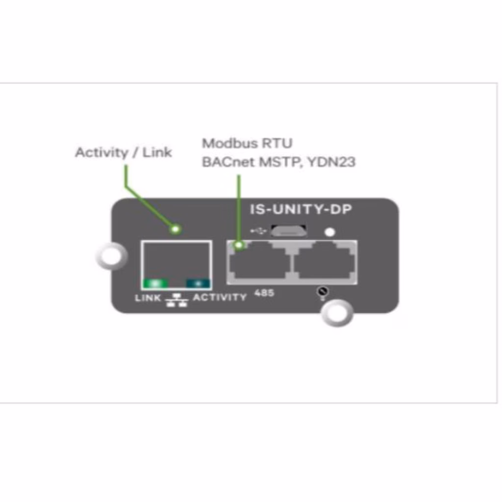 Fornisce accesso al Web, dati dei sensori ambientali, notifiche di allarme e protocolli di interfaccia di terze parti per le apparecchiature Vertiv e si integra con LIFE Services, Trellis e Liebert Nform. La scheda IS-UNITY-DP (doppio protocollo) consente ai clienti di abilitare due dei protocolli di terze parti supportati (SNMP, BACnet, Modbus e YDN23) per l'interfacciamento con applicazioni di gestione degli edifici o dei sistemi di gestione dei centri dati.