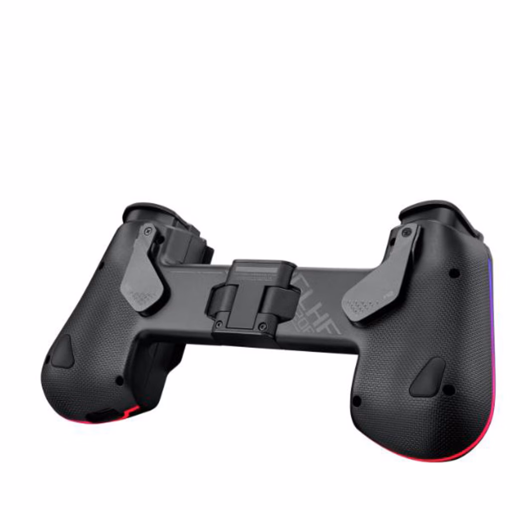 Design unico pieghevole: ROG Tessen può essere facilmente piegato e infilato in una borsa o in una tasca; tiene saldamente il telefono in orientamento orizzontale e protegge il connettore USB Type-C ® da eventuali danni durante l'installazione del telefono.