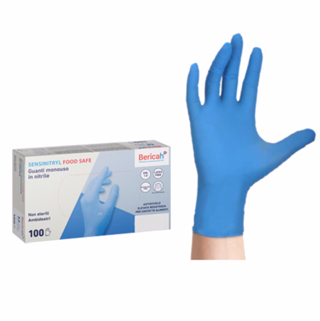 Guanti monouso in nitrile senza polvere BERICAH Sensinitryl FOOD SAFE colore azzurro taglia M