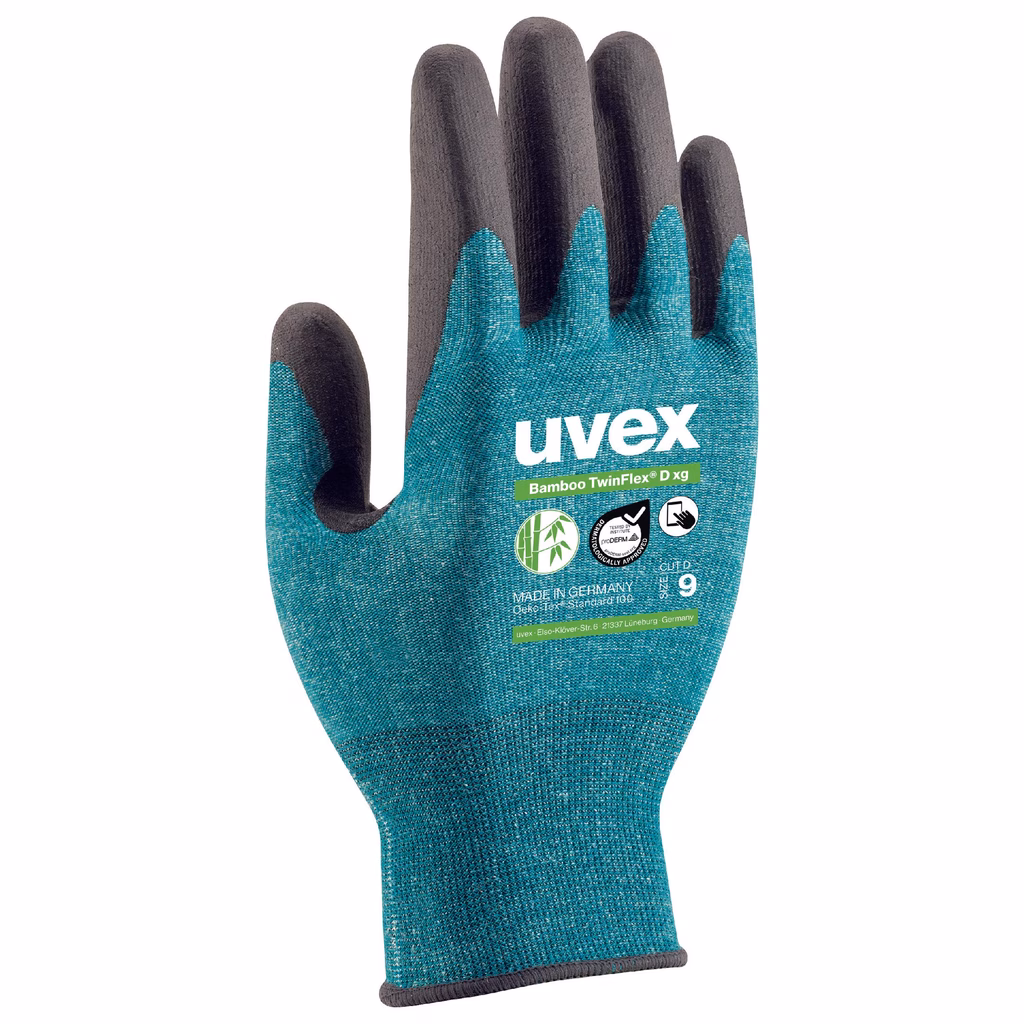 Guanto uvex Bamboo TwinFlex D xg - composto per il 45% da materiali sostenibili: poliammide riciclata e fibra di bamboo che assicura un'elevata traspirabilità creando un effetto seta sulla pelle, elevata sensibilità (18 aghi) e resistenza allabrasione, vestibilità versatile, particolarmente leggero, sottile e flessibile, elevata protezione da taglio (taglio D), funzionalità touch screen, protezione contro il calore da contatto fino a 100 °C