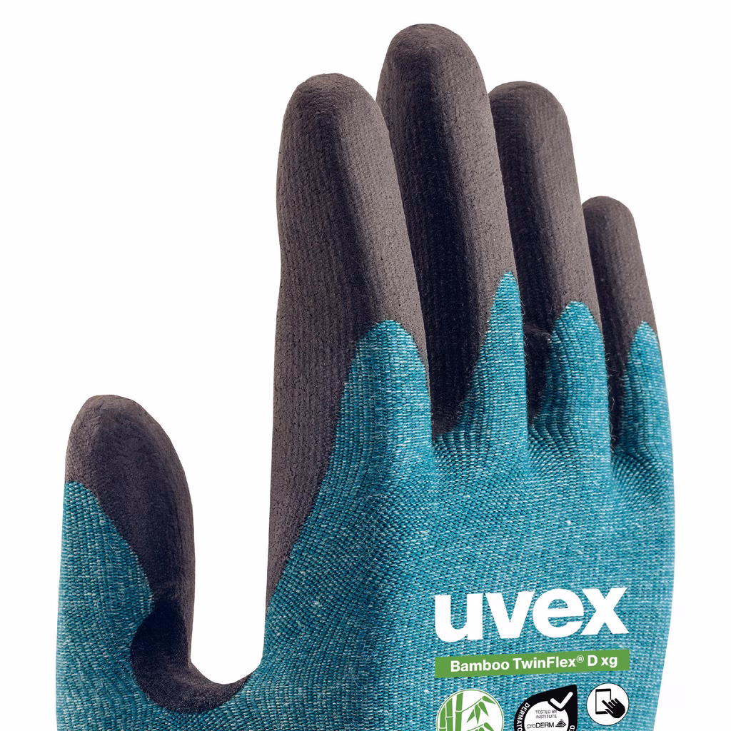 Guanto uvex Bamboo TwinFlex D xg - composto per il 45% da materiali sostenibili: poliammide riciclata e fibra di bamboo che assicura un'elevata traspirabilità creando un effetto seta sulla pelle, elevata sensibilità (18 aghi) e resistenza allabrasione, vestibilità versatile, particolarmente leggero, sottile e flessibile, elevata protezione da taglio (taglio D), funzionalità touch screen, protezione contro il calore da contatto fino a 100 °C