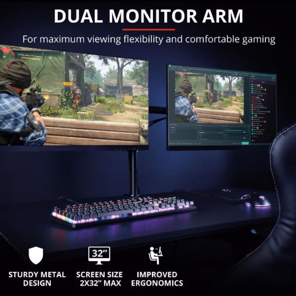 Se vuoi usare due monitor per giocare, per lo streaming o per lavorare, Trust GXT 1120 fa al caso tuo. Questo supporto dual-monitor può sostenere due schermi fino a 32" per un peso complessivo di 16 kg, riducendo l'ingombro sulla scrivania.