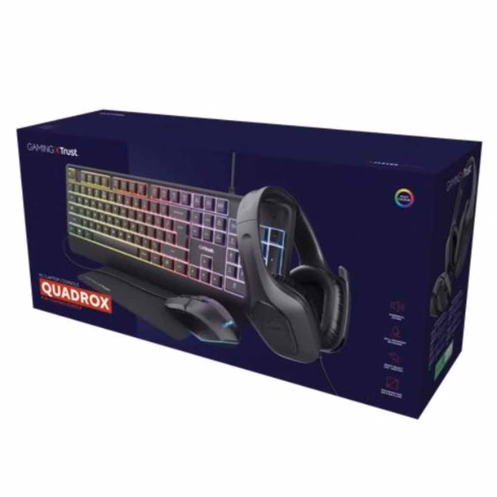 Tutto ciò che serve, in un unico pacchetto. Che tu sia agli inizi del tuo percorso da gamer o che voglia rinnovare la tua postazione, il pacchetto gaming Quadrox 4-in-1 ha tutto ciò che serve: tastiera e mouse illuminati, cuffie con microfono leggere e un tappetino per mouse. Si parte!
