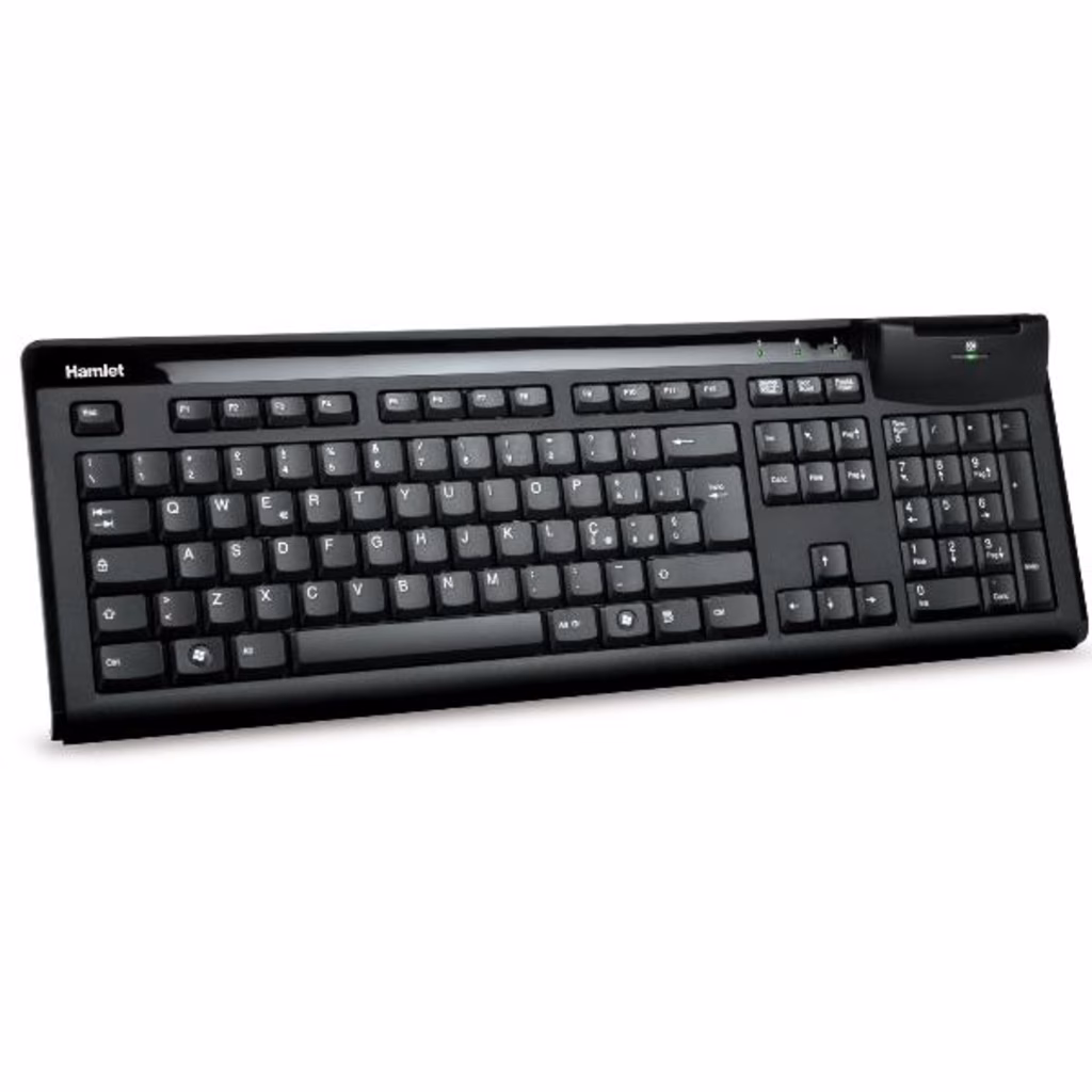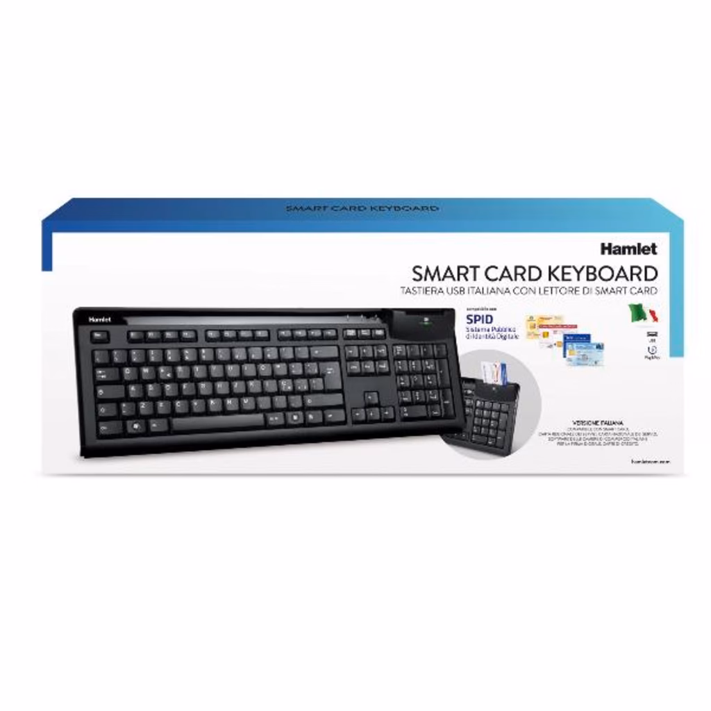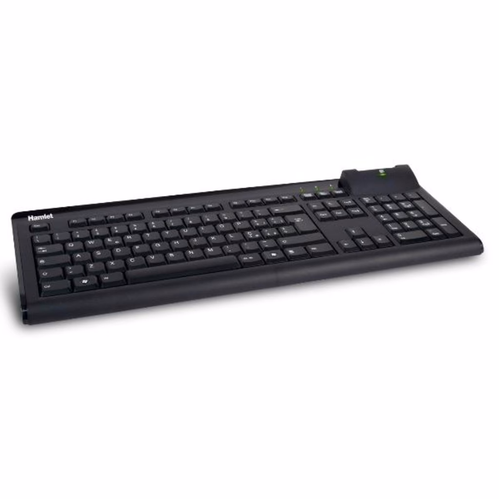 Smart Card Keyboard di Hamlet è una tastiera professionale studiata per un impiego confortevole e durevole nel tempo grazie ai tasti silenziosi a basso profilo, piedini pieghevoli robusti e supporti antiscivolo per una corretta inclinazione. Il lettore di Smart Card integrato permette di utilizzare la firma digitale per eseguire transazioni in ambiente sicuro sia su reti pubbliche che private. Smart Card Keyboard funziona con le smart card conformi allo standard ISO 7816 e supporta gli standard PC/SC 2.0 e USB-IF CCID. Grazie all'interfaccia USB Plug & Play è compatibile con qualsiasi computer e notebook. Certificazioni Microsoft WHQL e EMV.