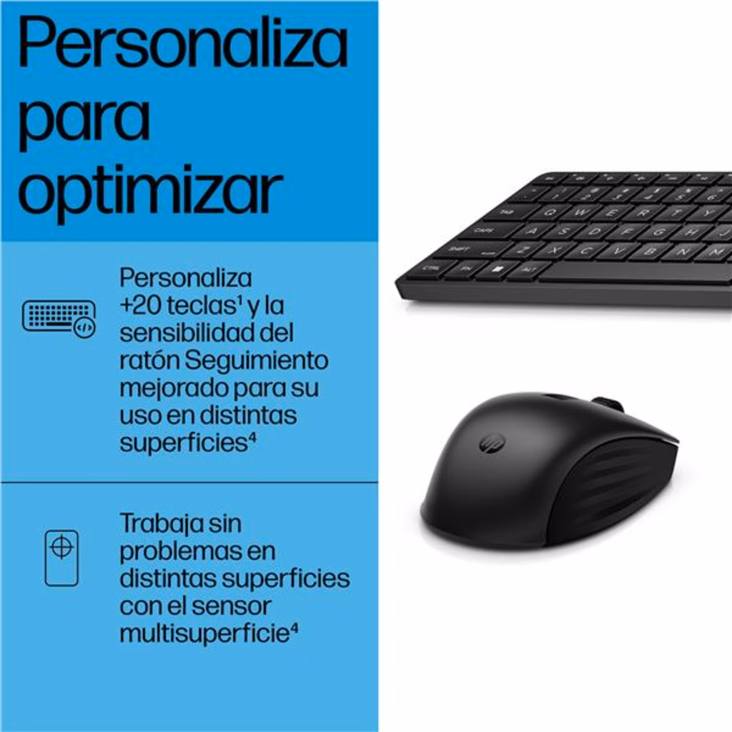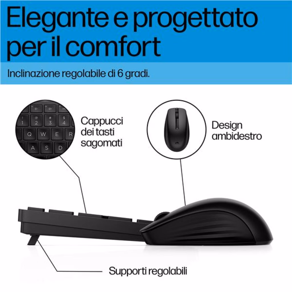 HP Tastiera e mouse wireless combinati 655Combinazione di tastiera e mouse per una produttività costante Comfort, produttività, affidabilità e stile: tutto in un'unica combinazione di tastiera e mouse wireless. Oltre 20 tasti personalizzabili sulla tastiera[1] e un tracciamento preciso con il mouse per lavorare meglio e più velocemente. Questa combinazione di mouse e tastiera contiene materiali riciclati[2] ed è anche facile da pulire e sanificare[3].Comfort ed eleganzaUna tastiera sottile ed elegante con piedini regolabili su 6 gradi di inclinazione, tasti sagomati e corsa di 2 mm per una digitazione accurata. Un mouse dal profilo sagomato e design ergonomico che offre il massimo comfort agli utenti sia mancini che destrorsi.Numerose opzioni di personalizzazione per lavorare meglioGrazie ad HP Accessory Center[1] potete programmare oltre 20 tasti, per lavorare in modo smart con le app che utilizzate di più. Inoltre, personalizzando le impostazioni DPI del mouse, potrete controllare la sensibilità e la velocità del cursore.Un mouse per la massima produttivitàIl mouse può comportarsi in maniera imprevedibile quando si passa da una superficie all'altra. Con il sensore adatto a più superfici, il cambio di postazione non sarà più un problema[4]. Il tracciamento migliorato consente di utilizzare il mouse su una gamma più ampia di superfici, incluso il marmo. Inoltre, grazie alla maggiore efficienza energetica del sensore, la batteria dura più a lungo.