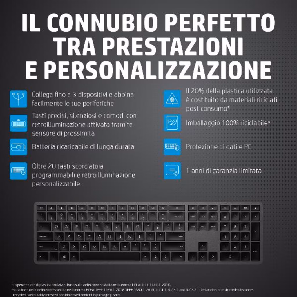 Una tastiera che assicura un'esperienza di digitazione silenziosa, efficiente e comoda. I tasti ad altezza speciale si adattano alla conformazione delle dita e sono studiati per ritornare in posizione dolcemente. I sensori smart personalizzabili permettono di regolare la retroilluminazione dei tasti in base alle condizioni di illuminazione dell ambiente, inoltre si accendono quando ti avvicini e si spengono quando il PC non è in uso, risparmiando energia.