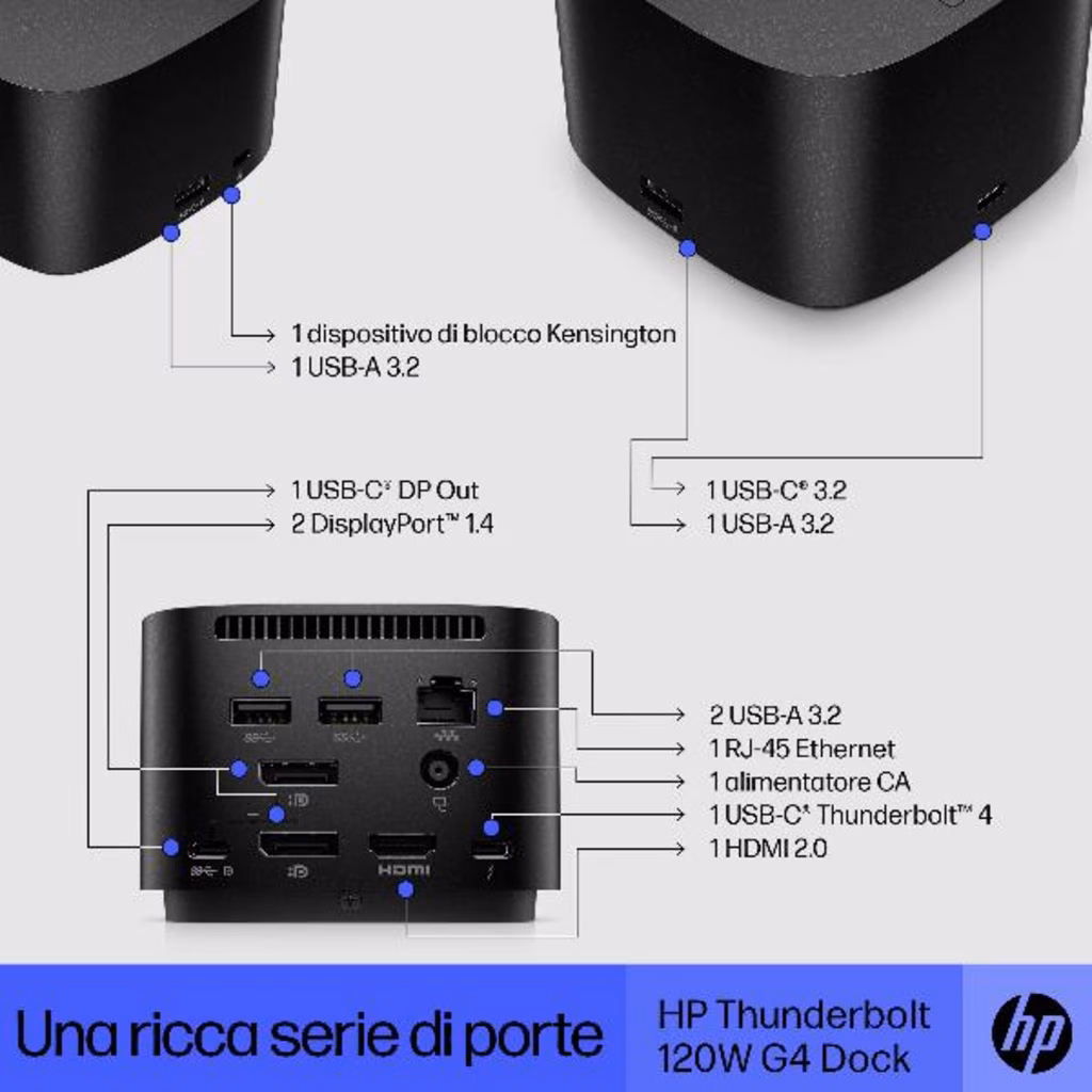 Notebook compatibili: Probook con porta USB-C (alt mode),  EliteBook e Zbook Firefly con porta USB-C Thunderbolt (come HP Thunderbolt dock 120W G2).