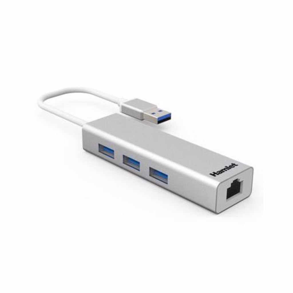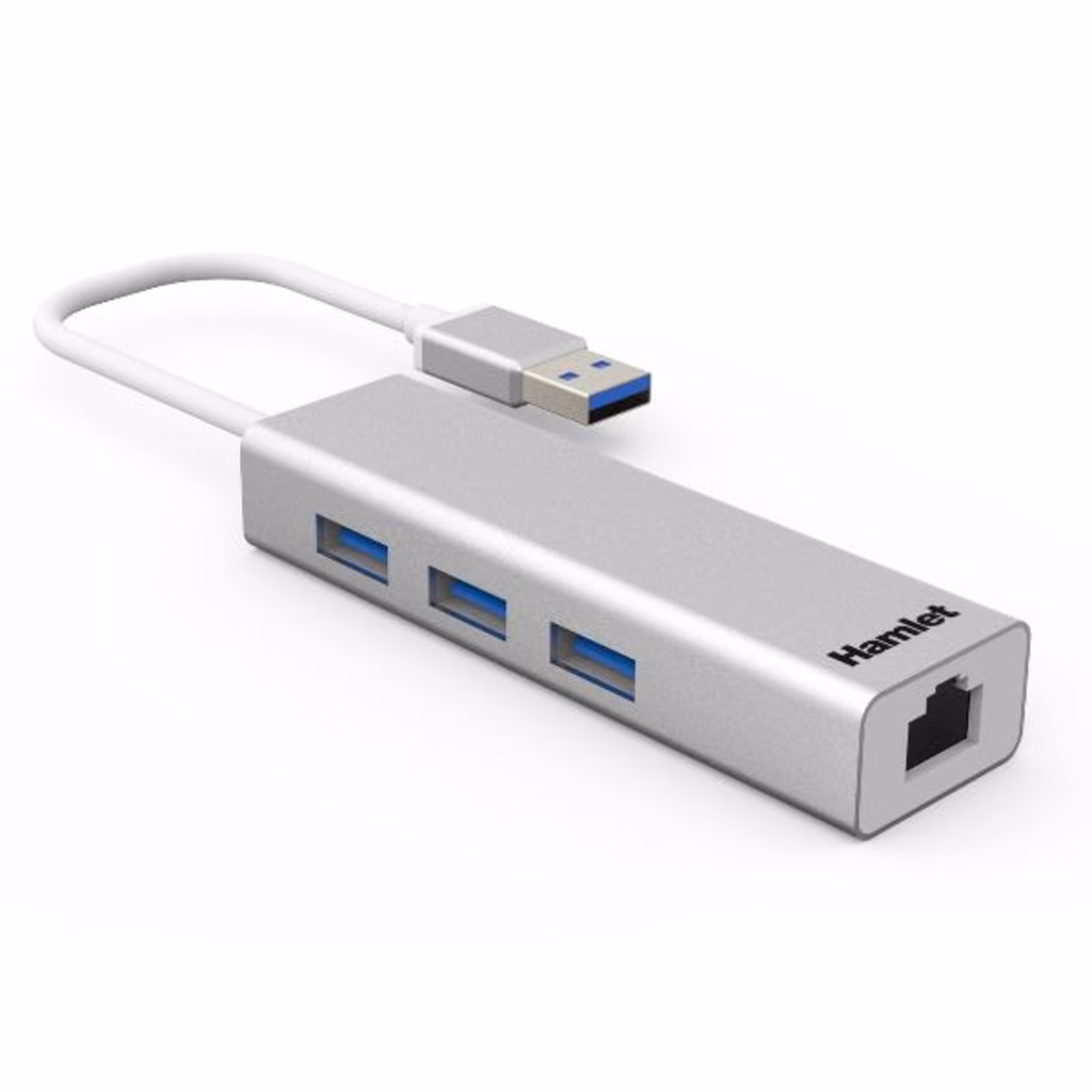 Hamlet Hub USB 3.0 + Lan è un adattatore USB 2 in 1 che aggiunge tre porte USB 3.0 e una scheda di rete Gigabit al computer permettendo l'uso simultaneo di tre dispositivi USB e connettività di rete fino a 1000 Mbps. La connessione USB 3.0 offre eccellenti prestazioni con un trasferimento dati fino a 5 Gbps. Il leggero design in alluminio e le dimensioni compatte lo rendono facile da trasportare.