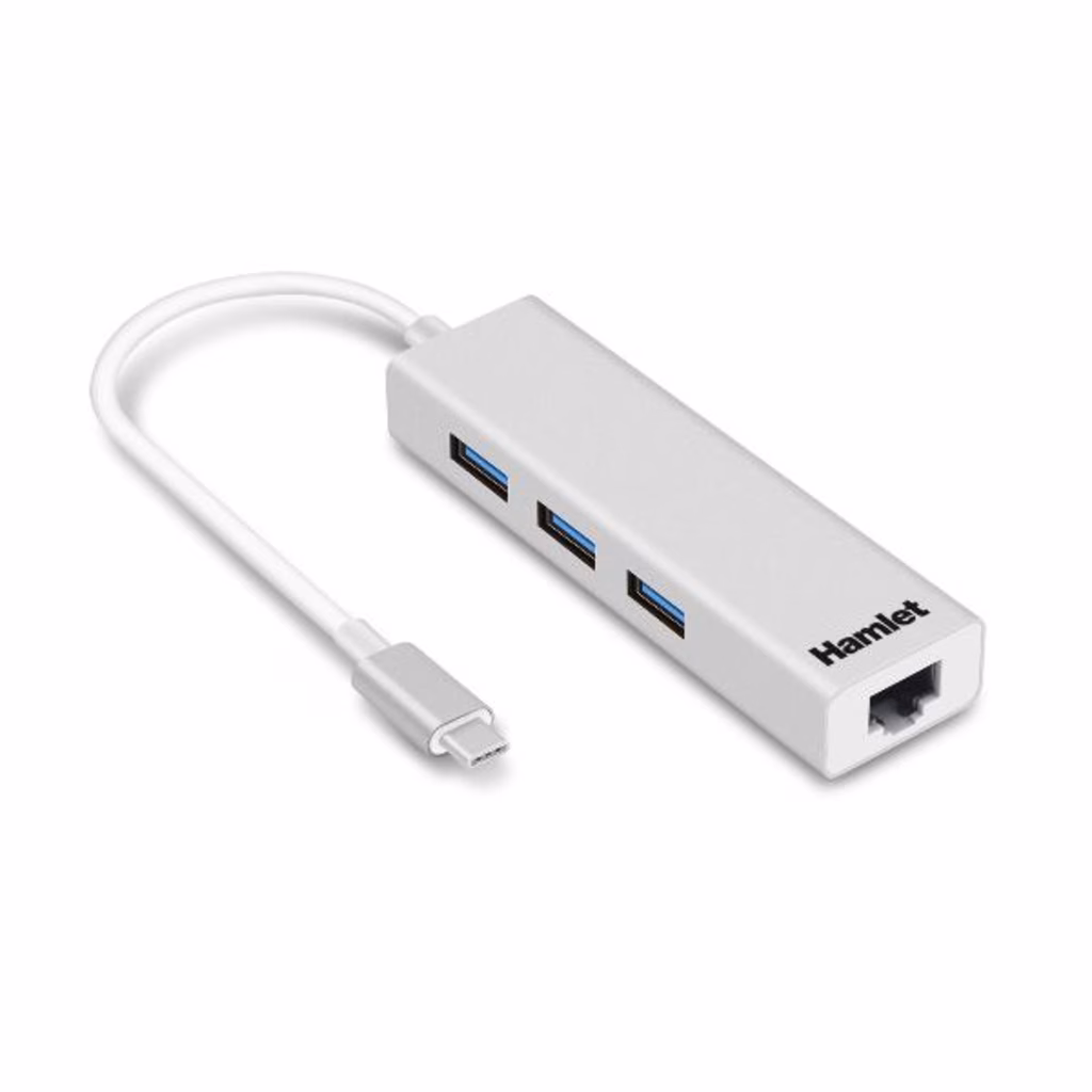 Hamlet USB 3.1 Type-C Hub + LAN è un adattatore 2 in 1 che aggiunge tre porte USB 3.0 Tipo A e una scheda di rete Gigabit al vostro notebook dotato di porta USB-C permettendo l'uso simultaneo di tre dispositivi USB e connettività di rete fino a 1000 Mbps. La connessione USB 3.1 Type-C offre eccellenti prestazioni con un trasferimento dati fino a 5 Gbps. Il leggero design in alluminio e le dimensioni compatte lo rendono facile da trasportare.caratteristiche