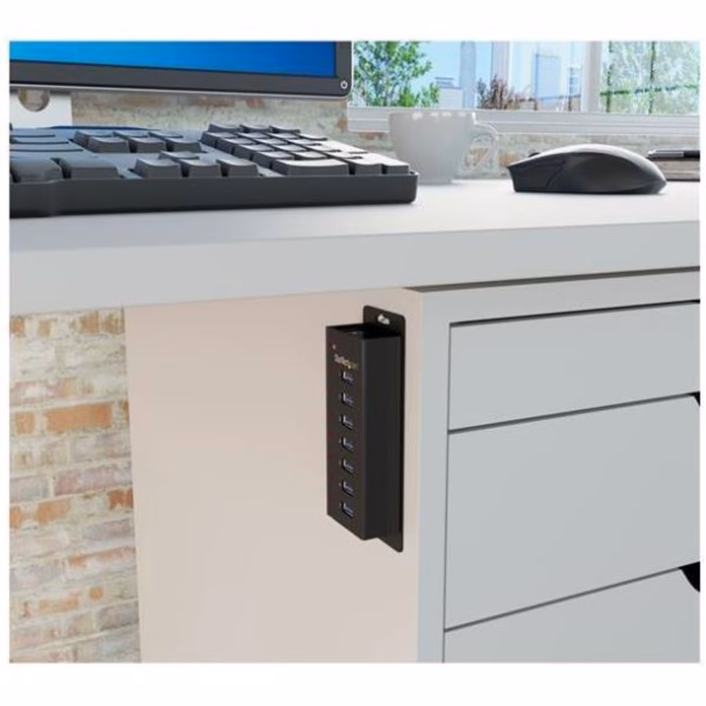 Questo hub è ideale per una configurazione permanente con un computer desktop grazie al resistente alloggiamento in metallo in grado di resistere all'usura e consumo provocati dall'utilizzo quotidiano. Può essere inoltre fissato a una superficie come, ad esempio, una scrivania o una parete, utilizzando la staffa per montaggio a parete inclusa.