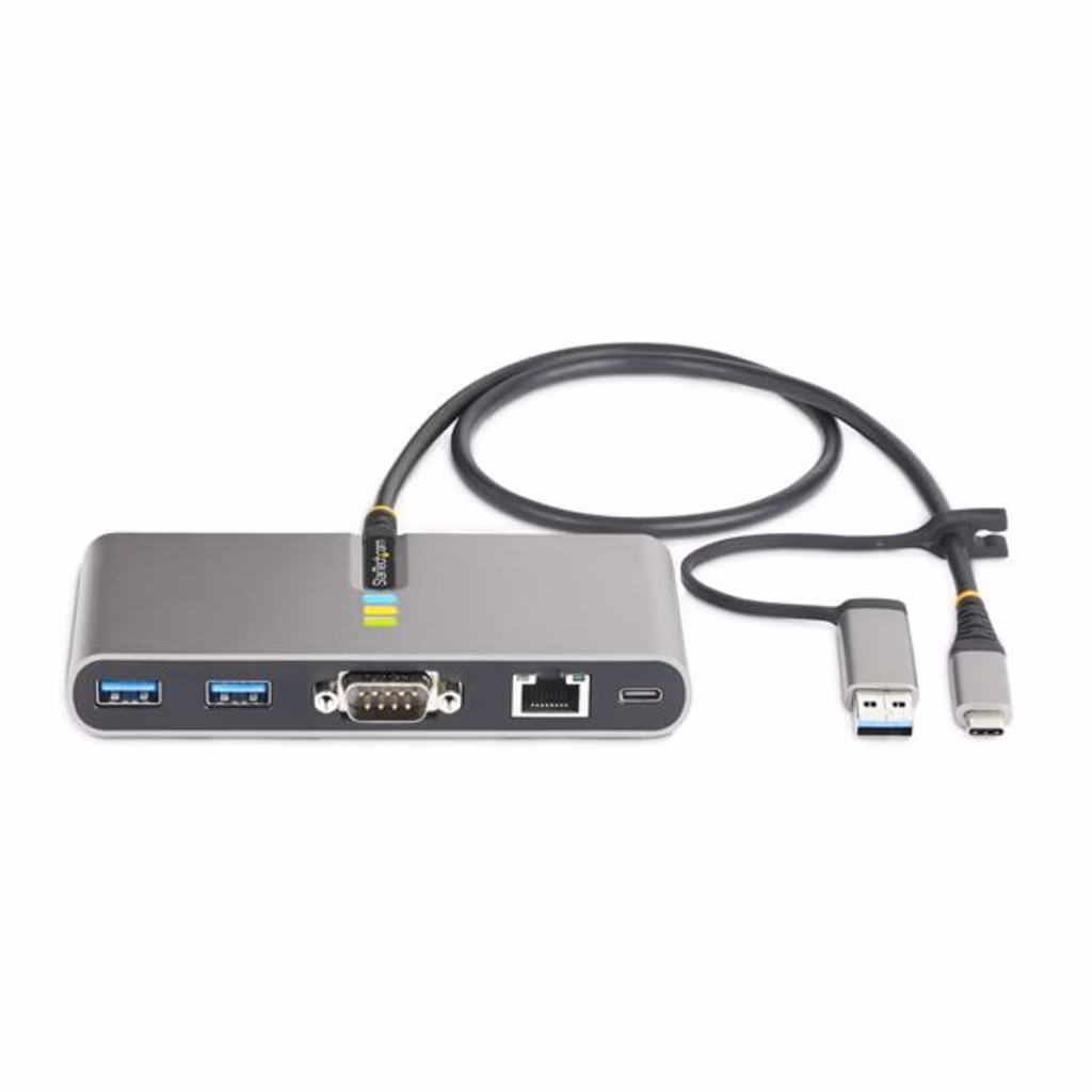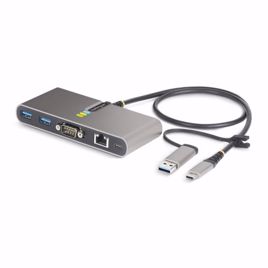 • HUB USB-C A 2 PORTE: hub USB 5Gbps portatile con cavo host USB-C integrato da 60cm e di un dongle USB-C a USB-A collegato; hub USB Tipo-A a 2 porte; protezione da sovracorrente; 1x adattatore seriale RS-232 (FTDI); 1x Gigabit Ethernet; 100W PD Pass-Through