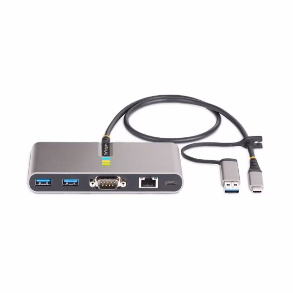 Hub USB-C a 2 porte con Ethernet e RS-232, dongle USB-C a USB-A collegato, 100W PD Pass-through, 2x USB-A 5Gbps, Gigabit Ethernet, RS232 seriale (FTDI)