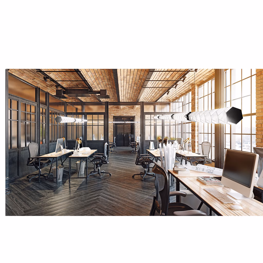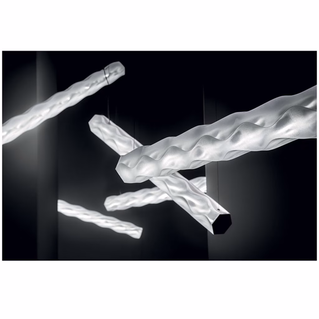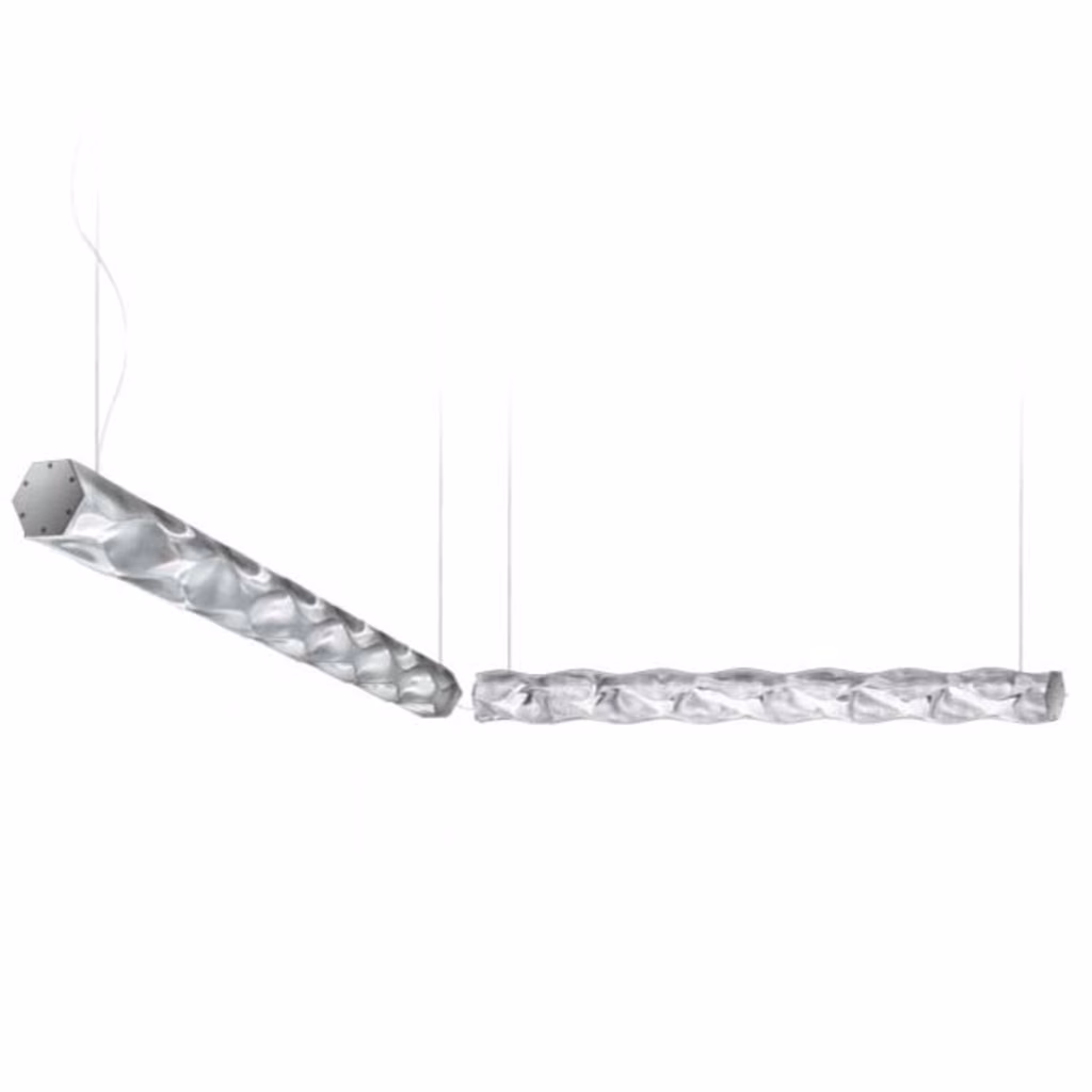 Linnovativo sistema Hugo Architectural permette di connettere fino a 7 elementi decorativi da 1 metro ciascuno con un solo attacco elettrico, unico rosone e alimentatore. La configurazione del sistema Architectural può variare da 2 a 7 elementi in base alle esigenze estetiche e illuminotecniche del progettista. Hugo offre una qualità di luce paritetica a quella degli apparecchi per illuminazione tecnica, in aggiunta al valore estetico tipico dei prodotti Slamp. I principali requisiti illuminotecnici per gli uffici, così come stabiliti allinterno della norma UNI EN 12464-1:2011 prevedono un livello di illuminamento medio sul piano di lavoro pari a 500 lx, un coefficiente di uniformità U0 maggiore di 0,6 e un valore di abbagliamento (UGR) minore di 19. I calcoli illuminotecnici eseguiti sia con la fotometria della versione Prisma che della White dimostrano la completa rispondenza dei progetti ai parametri richiesti, incluso lindice di Resa Cromatica (CRI) > 90. Versione a 2 elementi - colore prisma