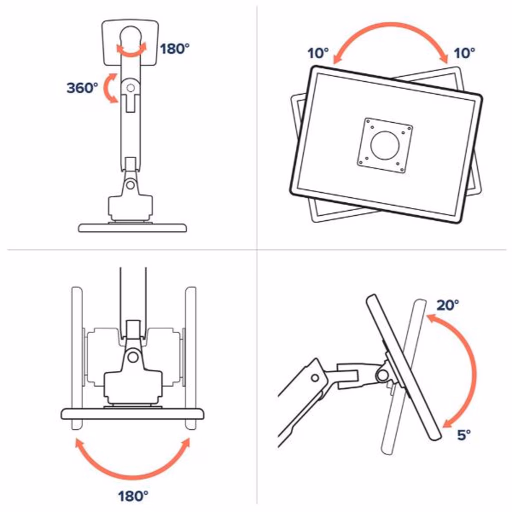 Il monitor può essere ruotato di 360° nel punto di connessione del braccio e dell'estensione; la rotazione è limitata a 180° nel punto di connessione dell'estensione e della base