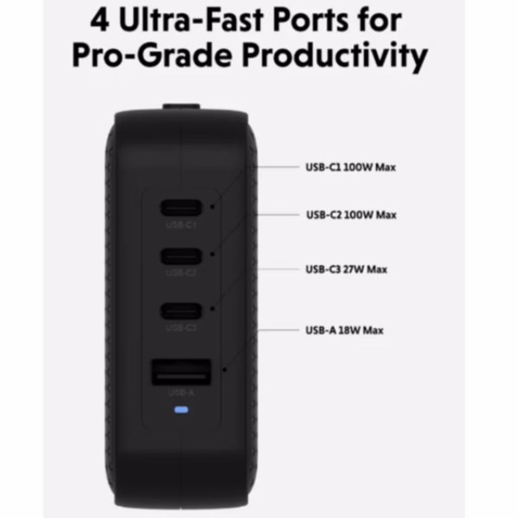 Può caricare fino a 4 dispositivi simultaneamente grazie a tre porte USB-C e una porta USB-A