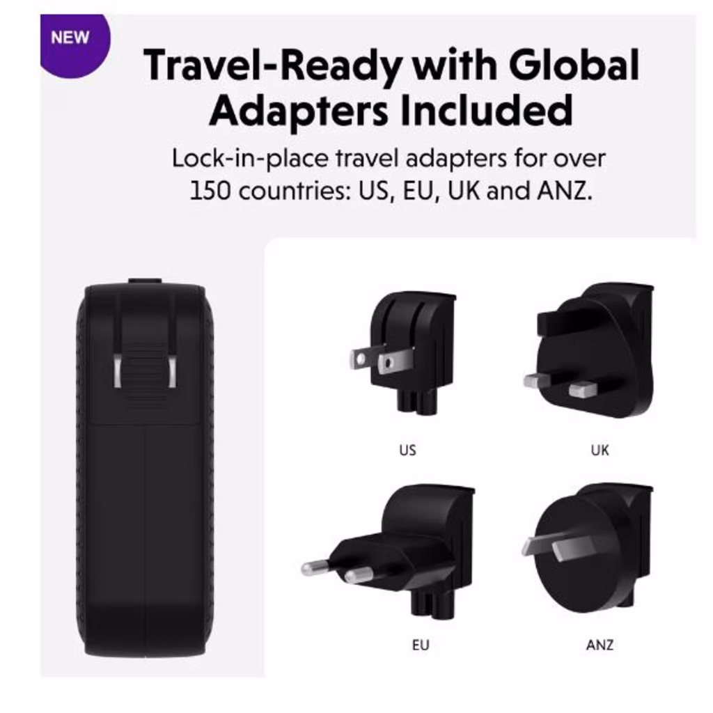 Tutto il necessario per viaggiare a livello globale, grazie al design compatto e agli adattatori da viaggio inclusi