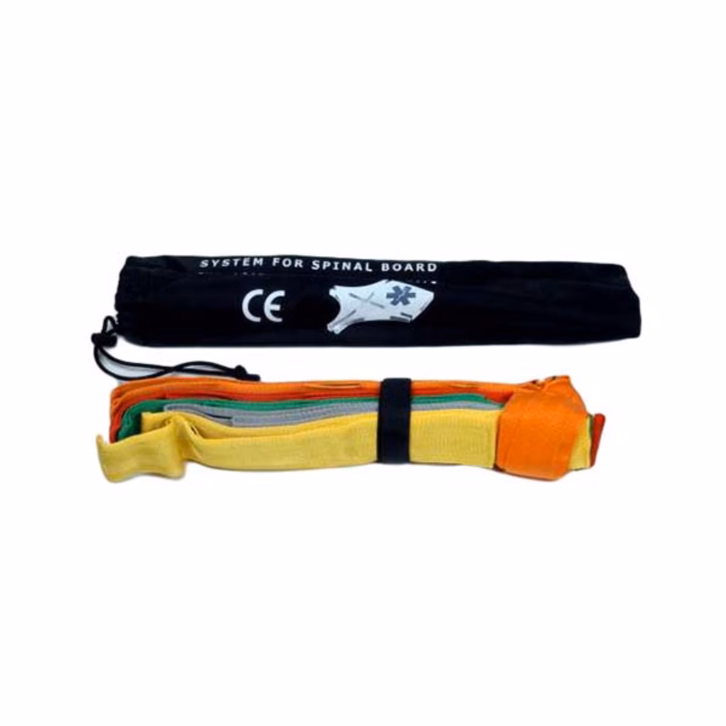Imbragatura a ragno per il bloccaggio dell'infortunato sulla tavola spinale. Ci sono 10 punti di fissaggio in nylon con chiusure con velcro. Fornita con custodia. REPERTORIO DISPOSITIVI MEDICI Ministero della Salute nr. 317630 classificazione CND V0899