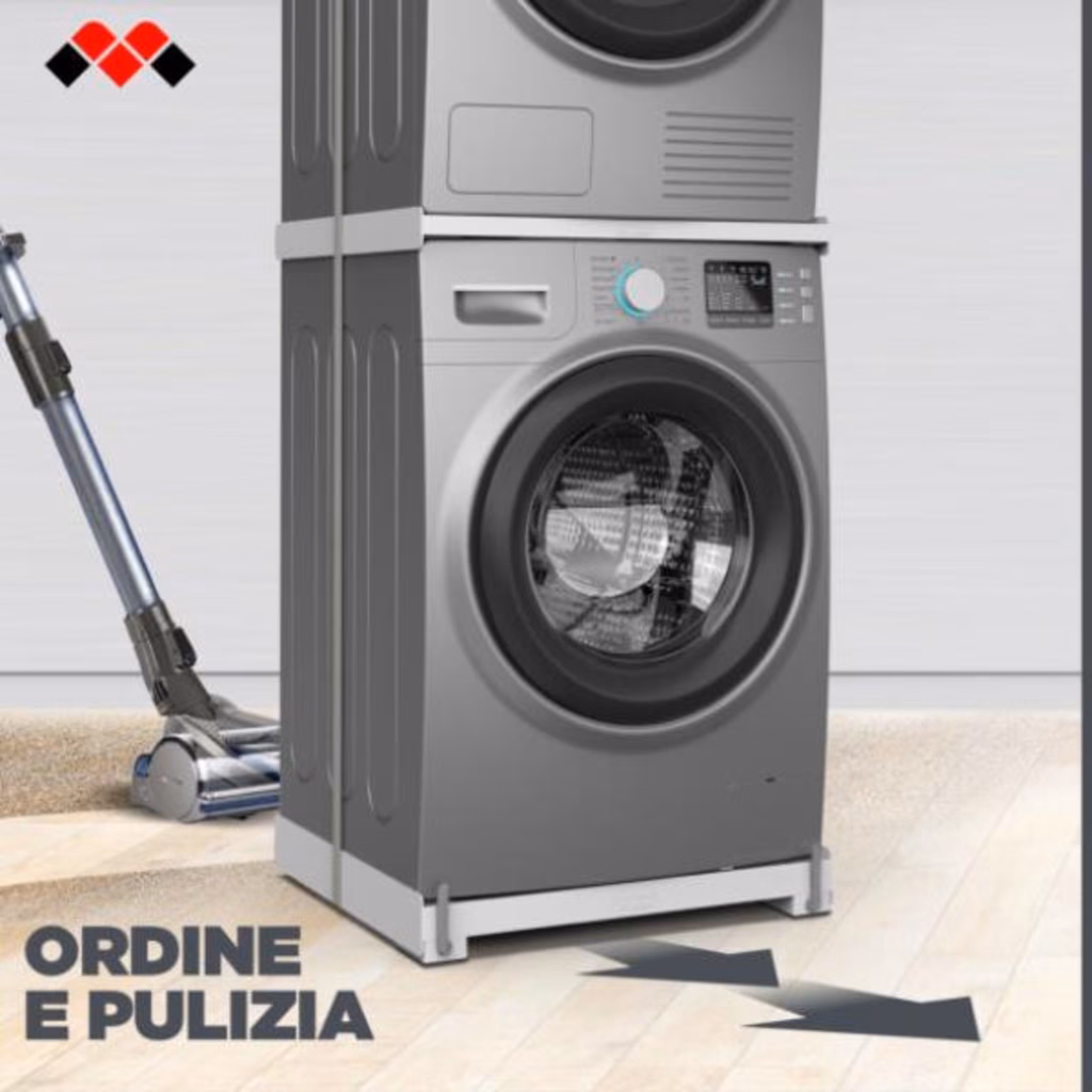 Moving Tower, il kit sovrapposizione lavatrice asciugatrice 2 in 1 di Meliconi, è la soluzione perfetta per creare una torre lavatrice-asciugatrice e facilitarne il movimento. Questo kit comprende il Torre Style e la Base Wash Evo, offrendo praticità e stabilità per i tuoi elettrodomestici.
