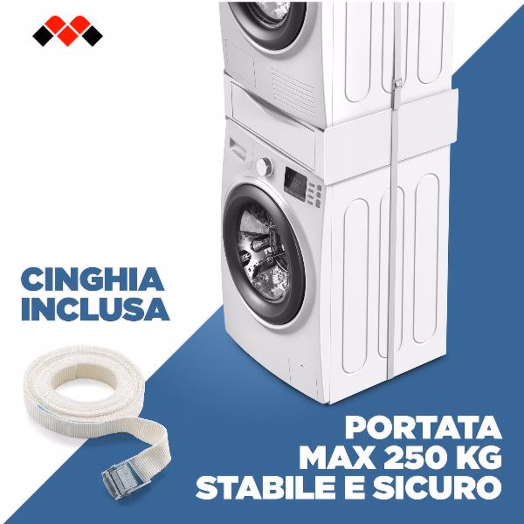 È inclusa una cinghia di sicurezza di 6 metri con fibbia in metallo. La struttura in resistente tecnopolimero, senza asole, prevede il passaggio della cinghia esterno. Il kit sovrapposizione lavatrice asciugatrice è premontato, rendendo l installazione facile e rapida.
