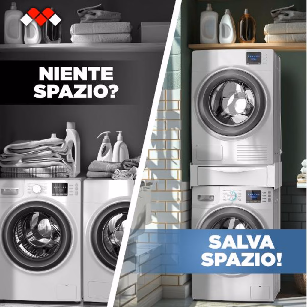 Questo kit sovrapposizione lavatrice asciugatrice consente di guadagnare spazio posizionando l asciugatrice sopra la lavatrice. È compatibile con tutte le lavatrici a carica frontale con una profondità minima di 45 cm e asciugatrici a carica frontale con una profondità fino a 70 cm (la distanza tra i piedini anteriori e posteriori dell asciugatrice deve essere massimo di 54 cm, piedini compresi).