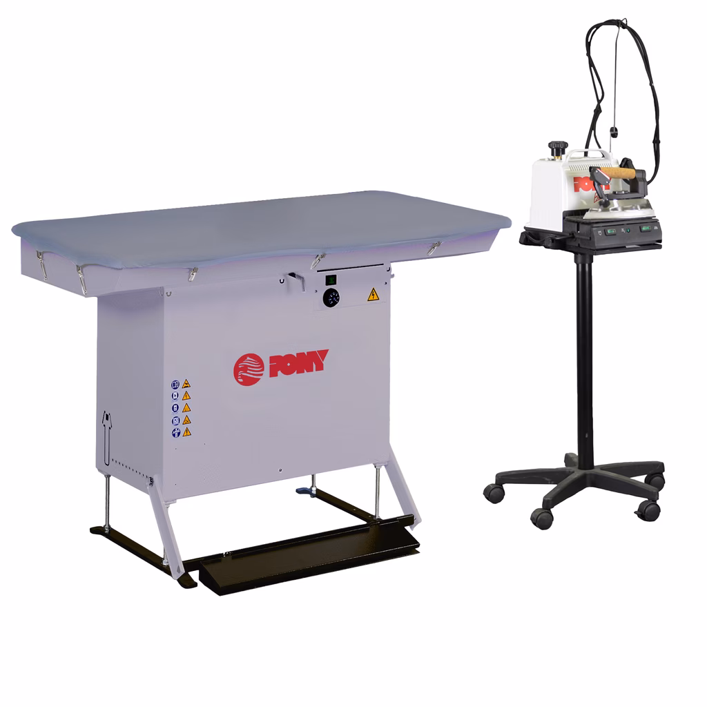 Tavolo da stiro rettangolare, aspirante, regolabile in altezza manualmente da 750 a 930 cm, con riscaldamento elettrico del piano regolabile tramite termostato, elevata potenza di aspirazione tramite aspiratore maggiorato incorporato nella macchina, azionabile a pedale, componentistica per utilizzo professionale e semi industriale, spina domestica Schuko con voltaggio 230V/1 50Hz. Completo di PONY BABY 4.0 e carrello con ruote. Struttura solida e robusta con piano rettangolare, ideale per lo stiro di capi ampi come lenzuola, tovaglie e tende, ma pratico anche per tutti gli altri indumenti. Progettato per Bed & Breakfast, piccole sartorie e laboratori, lavanderie self-service o laboratori o chiunque desideri qualità professionale senza occupare spazio eccessivo.