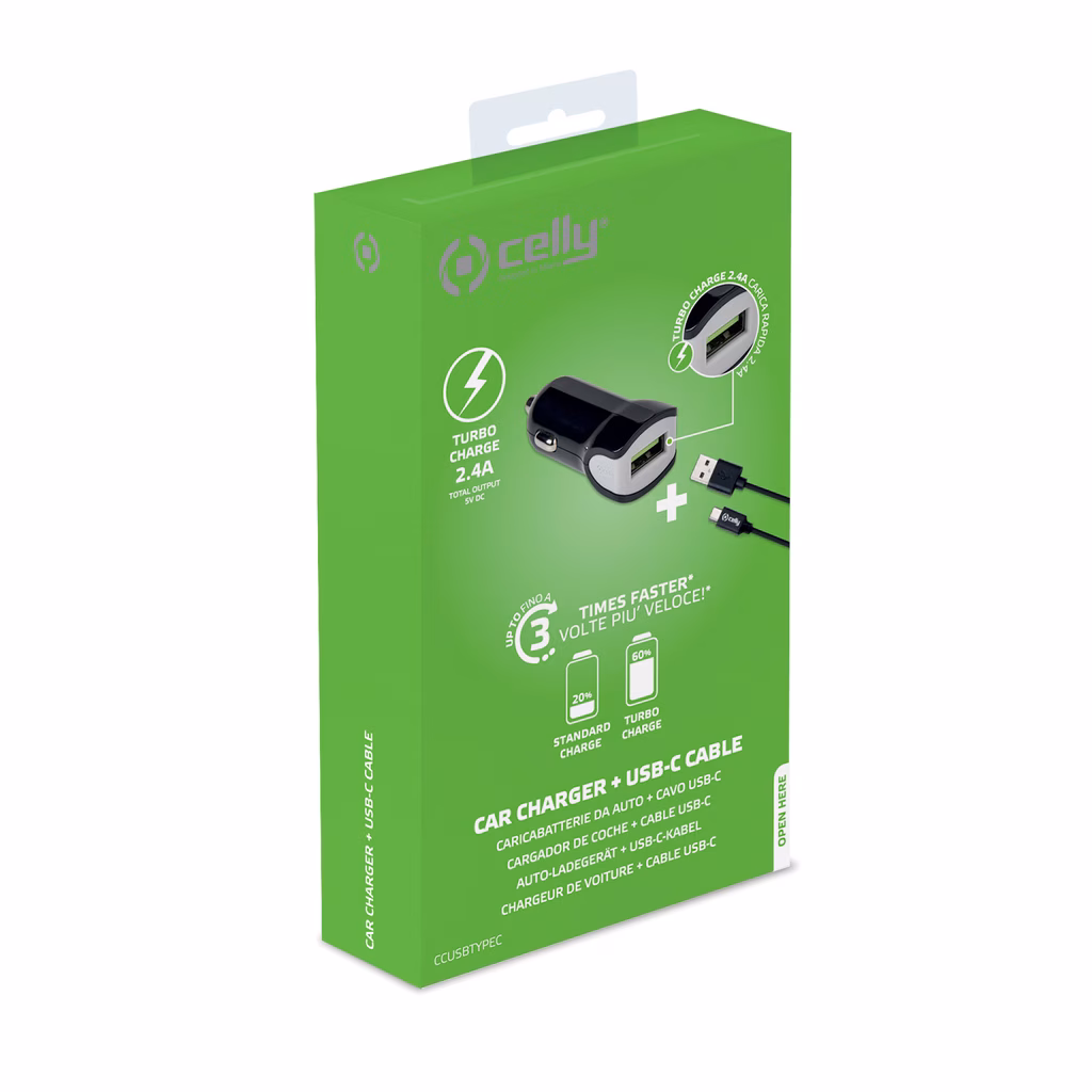CCUSBTYPEC è il caricabatteria da auto universale con porta USB-A e corrente di ricarica massima di 2.4 Ampere/ 12 Watt che permette la ricarica rapida di smartphone e tablet.