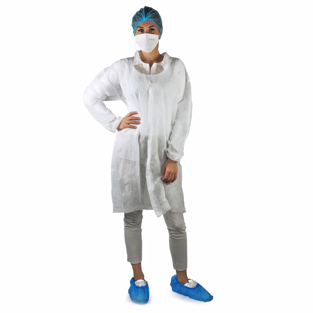 Set monouso per visitatore completo di camice in TNT, cuffietta in TNT, copribarba in TNT, mascherina in cellulosa a 2 veli, copriscarpe in CPE goffrato, imbustato singolarmente - taglia unica