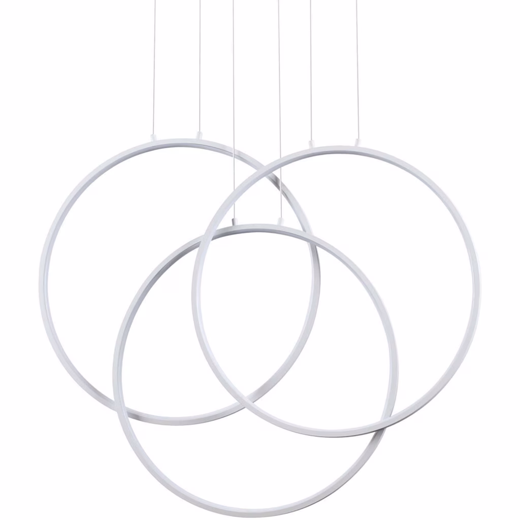 Base e montatura in metallo verniciato bianco opaco o nero opaco. Diffusori in materiale plastico colore opale. Cavi regolabili in lunghezza. Emissione luce diretta. L 68,5 x H min 80 / max 120 x P 13 cm. LED 82W. 30000 h. 3000 K. 8000 lumen. Lampadina inclusa. IP20