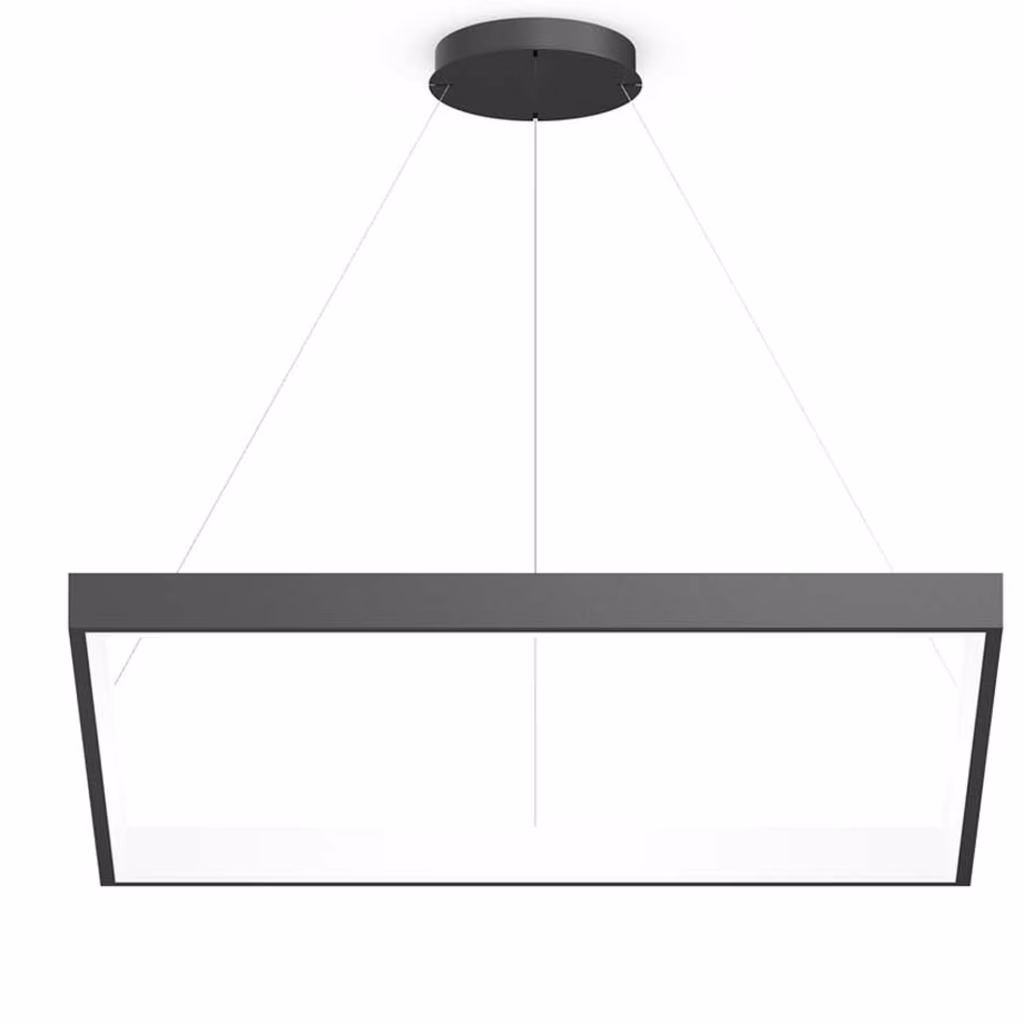Corpo illuminante quadrato in alluminio - verniciatura a polvere - sospeso con cavo a sospensione - regolazione altezza senza utensili - cavo di alimentazione trasparente incluso - alimentatore elettronico montato nel rosone - diffusore satinato in PMMA ad illuminazione assolutamente omogenea - emissione verso l'interno - emissione diretta/indiretta per maggiore accentuazione del soffitto e migliore comfort visivo - LED ad efficienza energetica con elevata resa cromatica - rosone con 2 ingressi cavi e morsetto per cablaggio passante