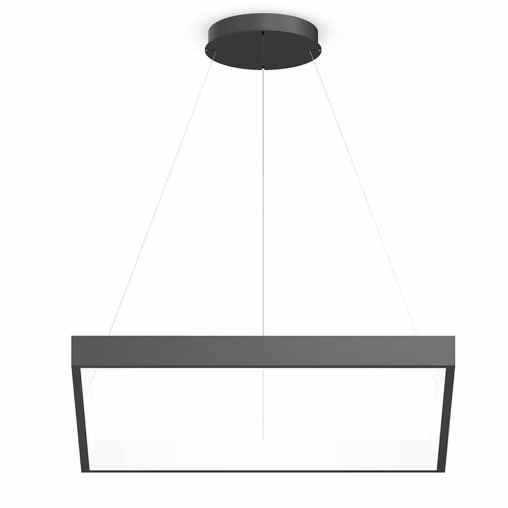 Corpo illuminante quadrato in alluminio - verniciatura a polvere - sospeso con cavo a sospensione - regolazione altezza senza utensili - cavo di alimentazione trasparente incluso - alimentatore elettronico montato nel rosone - diffusore satinato in PMMA ad illuminazione assolutamente omogenea - emissione verso l'interno - emissione diretta/indiretta per maggiore accentuazione del soffitto e migliore comfort visivo - LED ad efficienza energetica con elevata resa cromatica - rosone con 2 ingressi cavi e morsetto per cablaggio passante