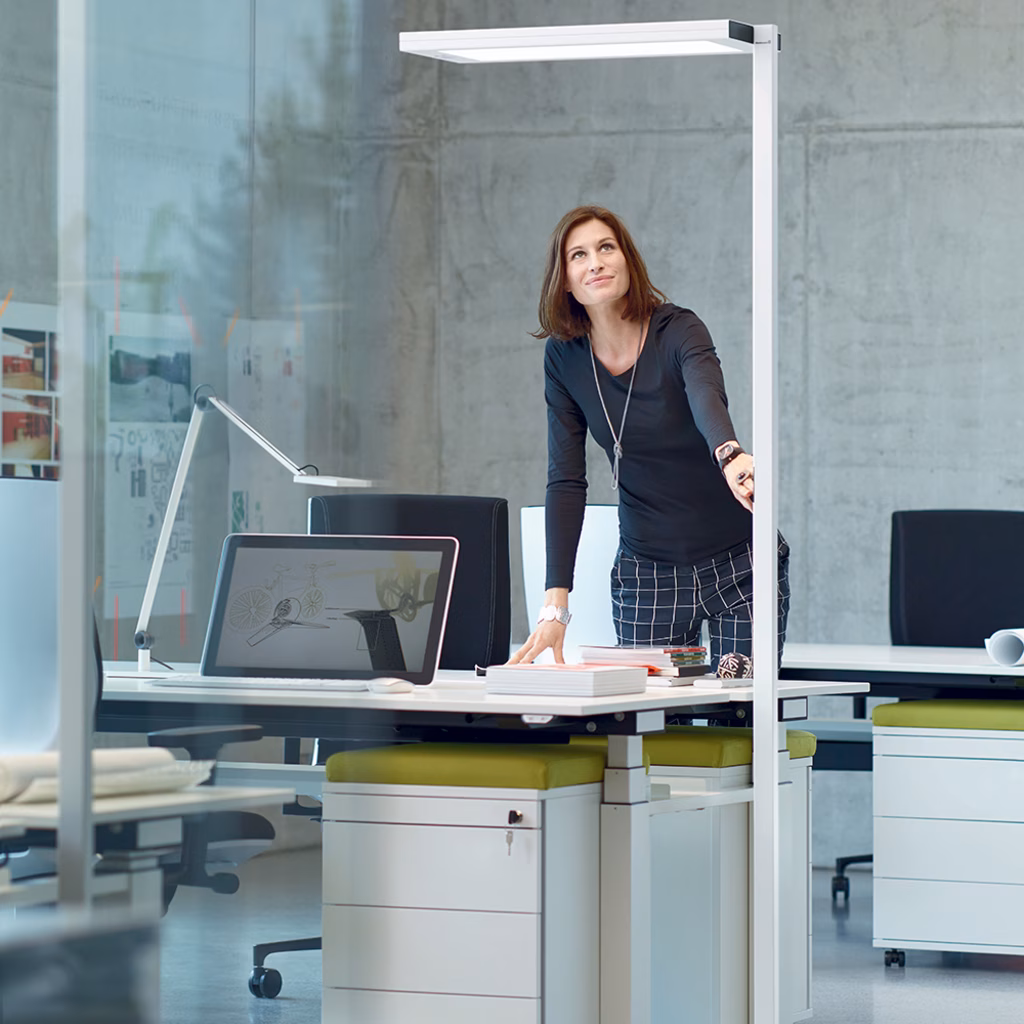 Apparecchio a stelo LED con comando multifunzione e testa ruotabile. Tecnologia antiabbagliamento con diffusore a prismi conici e Light Forming Technology Cradle to Cradle Certified TM Quota diretta con tecnologia Edgelight e Lightguide per unuscita della luce omogenea