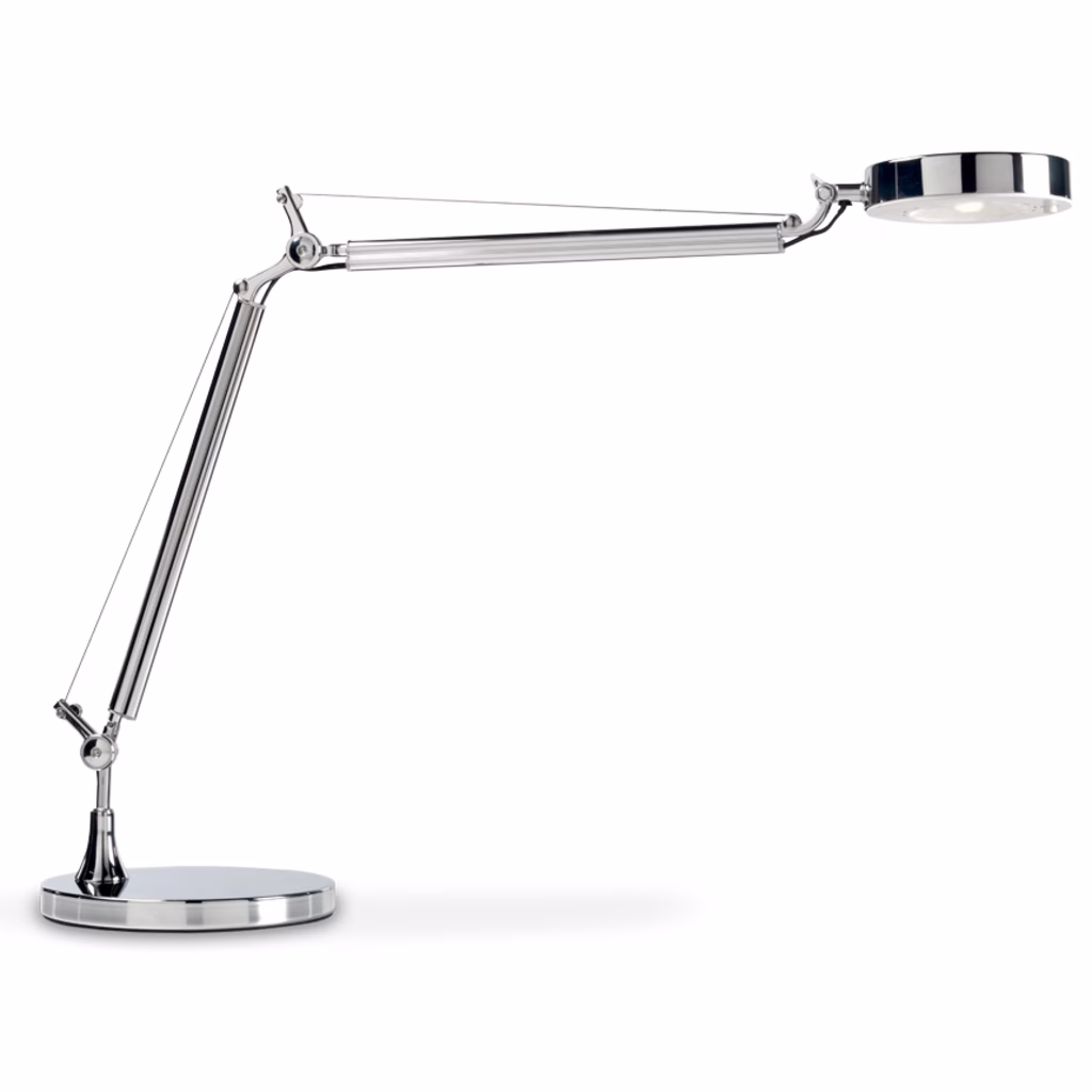Alter è una lampada da tavolo a pantografo realizzata in metallo verniciato. Il suo braccio regolabile è bilanciato dalla testa ottica orientabile. Alter illumina la scrivania grazie a un CoB Led alimentato da un driver integrato. Si completa con un cavo di alimentazione in silicone nero di 150 cm. ed un interruttore on/off posizionato sotto la testa del corpo lampada. Potenza/Flusso effettivo: 5W/410lm. CCT 4000K. Alimentazione 220÷240 V - class II. Classe energetica: LED. IP20. Colore Cromo