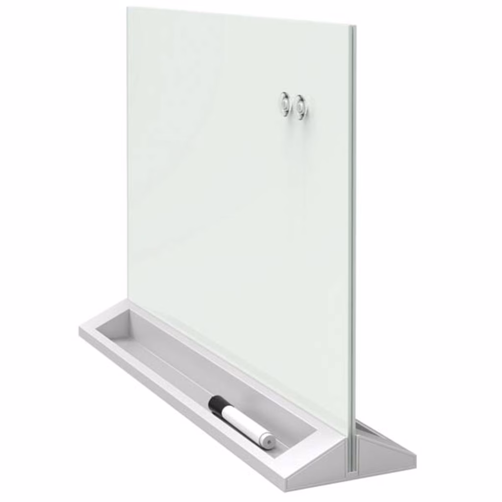 Lavagna in vetro multifunzionale, fronte/retro e cancellabile a secco, può essere utilizzata anche come divisore da scrivania, design minimalista e sta in piedi da sola. Vetro di sicurezza temperato e magnetico, perfetto per utilizzi frequenti. Elegante design senza cornice con utile scomparto nascosto, pennarello cancellabile a secco e magneti.