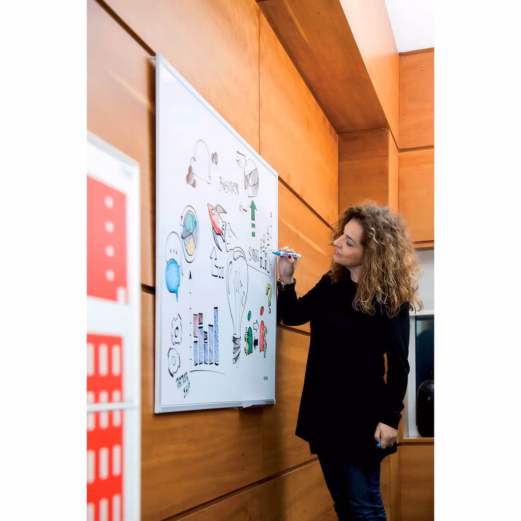 Perfetta per sale di formazione, conferenze, riunioni e scuole. Questa lavagna magnetica smaltata con proprietà antimicrobiche e telaio in alluminio anodizzato da 12 mm è ideale per un uso intensivo a lungo termine. Si pulisce facilmente con un panno asciutto, anche dopo un lungo periodo di utilizzo, e può essere montata in orizzontale o in verticale a seconda delle esigenze. La superficie non solo è magnetica, cancellabile a secco e antigraffio, ma è anche coperta da una garanzia di 25 anni. I fissaggi sono nascosti negli angoli per un look elegante. Sono inclusi un portapenne per lavagna e un kit di montaggio a parete. L'ufficio del futuro è uno spazio multifunzionale di interazione che incoraggia il lavoro di squadra, le nostre lavagne sono ottime soluzioni per offrirlo, fornendo un modo semplice per rimanere organizzati. Dimensioni 60x90 cm.