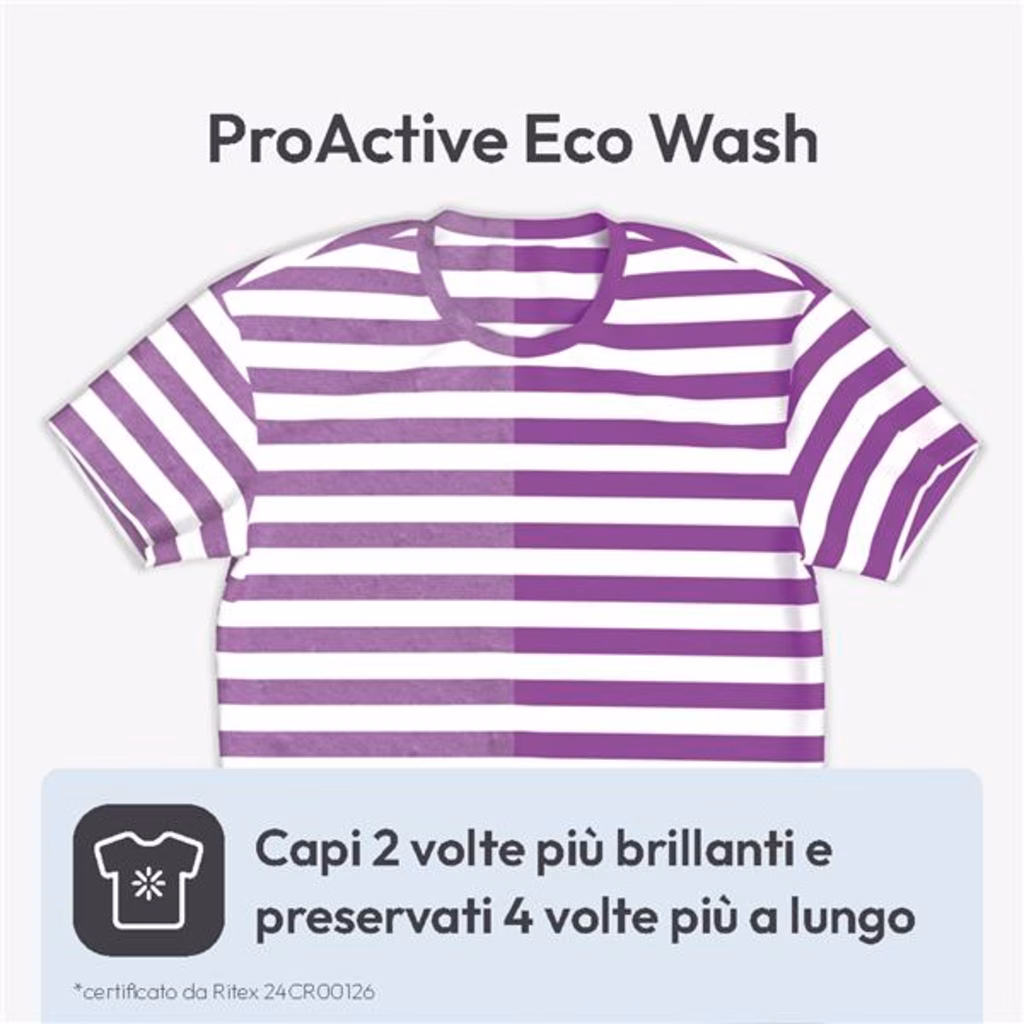 *Disponibile solo su certi modelliNessuna macchia sarà impossibile da rimuovereLasciati stupire dalla nuovissima tecnologia ProActive EcoWash: un mix di detersivo e acqua spruzzato direttamente sui capi, per mantenerli brillanti e preservare le fibre in profondità 4 volte più a lungo.*