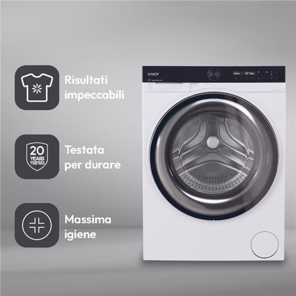 *Certificato da Ritex 24CR00126Il meglio di Candy per la migliore esperienza utente e di lavaggioLa lavatrice Candy è stata progettata nei minimi dettagli, per offrirti la migliore esperienza di lavaggio di sempre! Con hOn puoi gestire e controllare lo stato del lavaggio in qualsiasi momento, anche fuori casa, e ricevere notifiche quando il ciclo è completato. Grazie al suo schermo innovativo è come se l'elettrodomestico parlasse con te, dandoti tutte le informazioni di cui hai bisogno in modo più chiaro! Inoltre, il nuovo cassetto del detersivo sarà non solo più robusto, ma anche più facile da estrarre e pulire grazie alla sua forma ergonomica.Soddisfa le tue esigenze di lavaggio con i cicli speciali CandyProwash 700 ha il ciclo di lavaggio perfetto per ogni esigenza: con il Ciclo Anti-Pollution e il Ciclo di Lavaggio Smart, i tuoi vestiti saranno sempre freschi, privi di inquinamento e facili da stirare. E quando hai dubbi, puoi usare il delicato Ciclo di Lavaggio a Freddo a 20° per lavare qualsiasi capo a bassi consumi e con estrema cura. Inoltre, con un set completo di cicli rapidi da 14 a 59 minuti, questa lavatrice è la soluzione migliore per risparmiare tempo senza compromettere i risultati.Massima igiene per la tua lavatriceI nuovi Candy Clean Shields (TM) sono progettati per proteggere le aree più sensibili della tua macchina (come le guarnizioni dell'oblò) da muffe e batteri. Questo assicura un ciclo di lavaggio più igienico. Ma c'è di più! Lo Smart Spray, con il sistema a doppia iniezione d'acqua, pulisce il vetro dell'oblò dai residui di detersivo.Soft drum: massime performance e massima cura per i tuoi capiGrazie alle dimensioni speciali del cestello, Prowash 700 garantisce una pulizia superiore e massime prestazioni: la sua esclusiva saldatura laser senza giunture, abbinata all'innovativa superficie "soft drum", assicura la migliore cura e la massima protezione per i tuoi capi durante il ciclo di lavaggio.Intensive Options significa zero macchieCon Time Delay, decidi semplicemente quando vuoi che il ciclo finisca (fino a 24 ore) e la lavatrice calcolerà automaticamente l'ora di inizio. Così ora puoi essere sicuro che il bucato si adatti alla tua vita, e non il contrario! Inoltre, con le Intensive Options, puoi lavare via tutti i tipi di macchie con il tuo ciclo preferito grazie al risciacquo aggiuntivo.