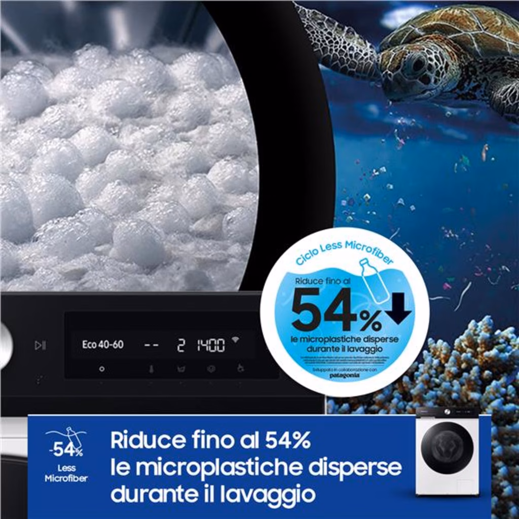 Samsung WW90DB7U94GEU3 lavatrice Caricamento frontale 9 kg 1400 Giri/min BiancoFino a un mese di lavaggi Fino a un mese di lavaggi Estrai il cassetto, versa detersivo e ammorbidente negli appositi scomparti. Il cassetto Ecodosatore eroga automaticamente la quantità necessaria per lavare i tuoi capi, senza sovradosare. Il dispenser può contenere fino a 30 dosi di detersivo[1]. Notifica sul tuo smartphone Cassetto Ecodosatore Il sensore del dispenser automatico rileva il livello residuo di detersivo e ammorbidente e ti avvisa quando stanno per terminare. Mai più senza detergenti! Lavaggio personalizzato Cassetto Ecodosatore Grazie allerogatore manuale puoi usare detersivo in polvere e detersivi specifici, come lana e seta. Gli erogatori automatici permettono di usare la quantità di detersivo necessaria in base alla durezza e al livello dellacqua. Massima qualità del lavaggio con l'intelligenza artificiale AI Wash Pulito profondo[2] senza aggredire i tessuti, con meno acqua e detergente[3]. AI Wash sfrutta unavanzata tecnologia di rilevamento automatico per calcolare il peso e la morbidezza dei tessuti e monitorare continuamente il livello di sporco, regolando di conseguenza la quantità di acqua e detergente e i tempi di ammollo, risciacquo e centrifuga. Risparmia tempo e Acqua AcquaSave Pulisci a fondo i tuoi capi, risparmiando tempo, acqua ed energia con la tecnologia Acqua Save. Grazie alla pompa di ricircolo, lacqua e il detergente vengono spruzzati sui capi dallalto e in maniera continua, consentendo di utilizzare fino al 20% di acqua in meno[4] e di aumentare lefficacia del detersivo. Questo sistema migliora le prestazioni di lavaggio, riducendo la durata dei cicli fino al 25%[4] e consumando meno energia. In collaborazione con Patagonia Ciclo Less Microfiber Samsung, Ocean Wise Plastics Lab e Patagonia collaborano per trovare soluzioni al problema dellinquinamento da microfibre. Il ciclo di lavaggio appositamente ideato da Samsung riduce il rilascio di microfibre anche del 54%. Un primo passo a tutela della salute degli oceani. Bucato perfetto in 39 minuti Super Speed Pulisci i tuoi capi in profondità e in meno tempo. Il programma Ecolavaggio Rapido 39' completa un ciclo di lavaggio giornaliero in soli 39 minuti[5]. Grazie alla funzione Speed Spray, risciacqua i capi con maggiore efficacia e aumenta la velocità di centrifuga per completare il lavaggio in soli 39 minuti. Risparmiare tempo è una scelta vincente QuickDrive Con l'opzione QuickDrive il tempo di lavaggio si riduce fino al 50%[6]. Grazie alla rotazione dinamica del cestello e allintensificazione dei getti dacqua, frutto della tecnologia Speed Spray, il detersivo penetra più velocemente e lava i tessuti in modo rapido e delicato. L'opzione QuickDrive consente di ridurre il tempo di lavaggio su ben 11 programmi. Il massimo delligiene Vapore igienizzante Dona ai tuoi capi una pulizia igienica e profonda grazie allazione del vapore, che rimuove lo sporco incrostato e il 99,9% dei batteri[7] e inattiva gli allergeni derivanti dagli acari della polvere domestica nel bucato[8] Il ciclo di vapore igienizzante riduce lesposizione ad acari della polvere, peli di cane e gatto, pollini e funghi[9] Smacchiatura Intensiva Smacchiatutto Plus Anche lo sporco più ostinato si arrenderà alla funzione Smacchiatutto Plus, che contribuisce a rimuovere le macchie più difficili, come sangue, tè, vino, erba e trucco. I capi vengono immersi in una nuvola di bolle attive, che scioglie lo sporco e le macchie per consentire una rimozione più efficace[10]. Prenditi cura della tua lavatrice Ecopulizia Cestello + Ligiene del bucato passa anche da quella della lavatrice. Ecoplizia Cestello + rimuove dal cestello il 99,9% dei batteri causa di cattivi odori[11] , senza luso di costosi detergenti. Inoltre, il potente getto dacqua e la centrifuga rapida rimuovono lo sporco dalla guarnizione delloblò. E ci pensa la lavatrice ad avvisarti quando è il momento di eseguire la pulizia periodica[12]. Silenzioso, performante e affidabile Motore Digital Inverter Vorresti unefficienza superiore, meno rumori e prestazioni più durature? La tecnologia Digital Inverter sfrutta dei solidi magneti che consentono di ottenere i risultati desiderati in maniera efficace e silenziosa[13] , consumando meno energia rispetto un motore universale. Questo, inoltre, è il motore più duraturo del settore, coperto da una garanzia di 20 anni[14]. Una bellezza che dura nel tempo Oblò in vetro temperato Con questo oblò in vetro temperato, la tua lavatrice manterrà la sua bellezza intatta nel tempo, anche se viene aperta e toccata continuamente. Il vetro temperato, resistente e durevole, tende a rompersi o a graffiarsi molto di meno rispetto a un oblò in plastica. Inoltre, è una soluzione elegante che migliora anche la visibilità all'interno della lavatrice. Lavaggio intelligente AI Control Scopri un nuovo livello di comodità grazie allintelligenza artificiale, che personalizza il lavaggio ricordando le tue abitudini, suggerendoti i cicli più indicati e visualizzando le informazioni giuste quando servono. Usa lapp SmartThings[15] per scegliere il ciclo, programmare il lavaggio, risolvere i problemi e impostare in automatico il ciclo di asciugatura ideale[16]. Risparmio energetico intelligente SmartThings e AI Energy Mode Monitora e riduci il consumo elettrico della tua lavatrice. Grazie alla modalità AI Energy Mode[17] puoi controllare facilmente il consumo di energia ed effettuare una stima della bolletta. Con i programmi che funzionano in AI Energy Mode[18] , i consumi si riducono anche del 70%[19] : basta attivare lopzione Ecobubble per lavare con acqua fredda anziché calda, senza allungare il ciclo. Sempre connessi grazie a SmartThings Wi-Fi integrato Semplifica e ottimizza l'uso della tua lavatrice con lapp SmartThings[20]. Laundry Recipe ti consiglia il ciclo di lavaggio più indicato[21]. Laundry Planner ottimizza la tua programmazione giornaliera[22]. Infi