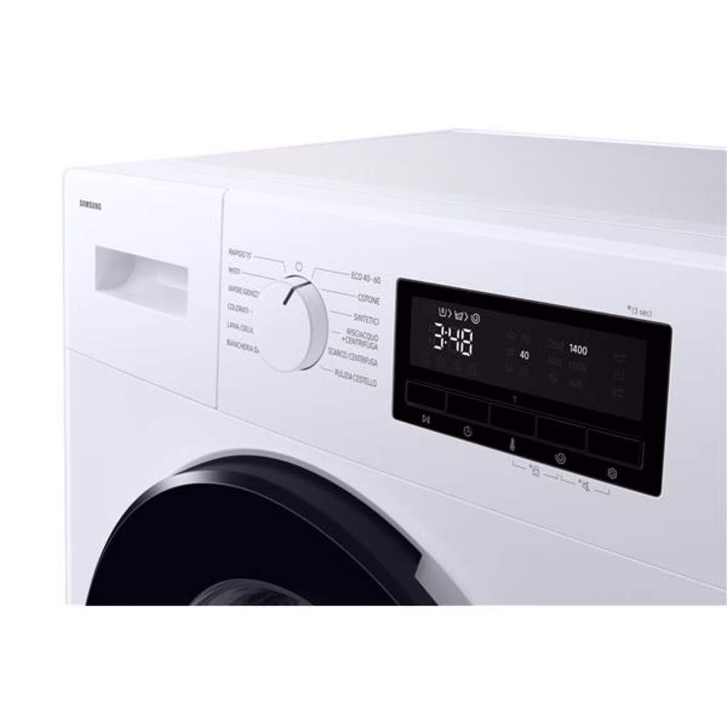 Samsung Lavatrice Serie 3000 9Kg WW90DG5G34AEETEfficienza energetica Efficienza energetica classe A Lava i tuoi capi risparmiando energia. Le tecnologie avanzate ottimizzano in modo intelligente le prestazioni di lavaggio e riducono i consumi senza compromettere le funzionalità. Prenditi cura della tua lavatrice Ecopulizia Cestello Mantenete l'interno della vostra lavatrice igienicamente pulito e fresco. Drum Clean rimuove i residui di detersivo e lo sporco presenti nel tamburo mediante una combinazione di ammollo, pulsazione e rotazione ad alta velocità. Inoltre, il dispositivo vi avvisa automaticamente quando è necessario pulirlo[1]. Silenzioso, performante e affidabile Motore Digital Inverter Vorresti unefficienza superiore, meno rumori e prestazioni più durature? La tecnologia Digital Inverter sfrutta dei solidi magneti che consentono di ottenere i risultati desiderati in maniera efficace e silenziosa[2] , consumando meno energia rispetto un motore universale. Questo, inoltre offre una durata eccezionale, supportata da una garanzia di 10 anni[2] sul motore. Lavaggio Rapido Lava in 15 minuti Per lavare in maniera rapida ed efficiente i capi poco sporchi puoi usare il programma Lavaggio rapido: piccoli carichi di biancheria[3] pronti in soli 15 minuti. Perfetto per chi è sempre di fretta, per chi desidera avere i propri capi preferiti sempre a disposizione o per chi vuole evitare pile enormi di panni sporchi, ottenendo risultati eccezionali[4] in poco tempo. Comodo controllo Fine Programmata Non lasciare i capi bagnati allinterno della lavatrice troppo a lungo, favorendo la formazione di odori sgradevoli. Con la Fine Programmata puoi posticipare il termine di un ciclo di lavaggio fino a 24 ore. Potrai così avviare il programma di notte e impostarlo in modo tale che il lavaggio termini quando rientri dal lavoro, per un bucato sempre fresco.Efficienza energeticaEfficienza energetica classe A